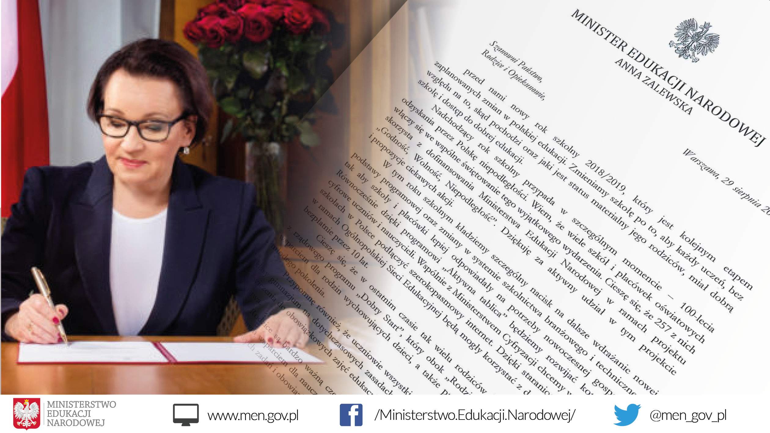 Dziś, 29 sierpnia br. Minister Edukacji Narodowej Anna Zalewska skierowała list do rodziców i opiekunów, w którym poinformowała o najważniejszych zmianach w nowym roku szkolnym 2018/2019, w tym m.in. dalszym wdrażaniu nowej podstawy programowej oraz rozwiązań dotyczących szkolnictwa branżowego i technicznego