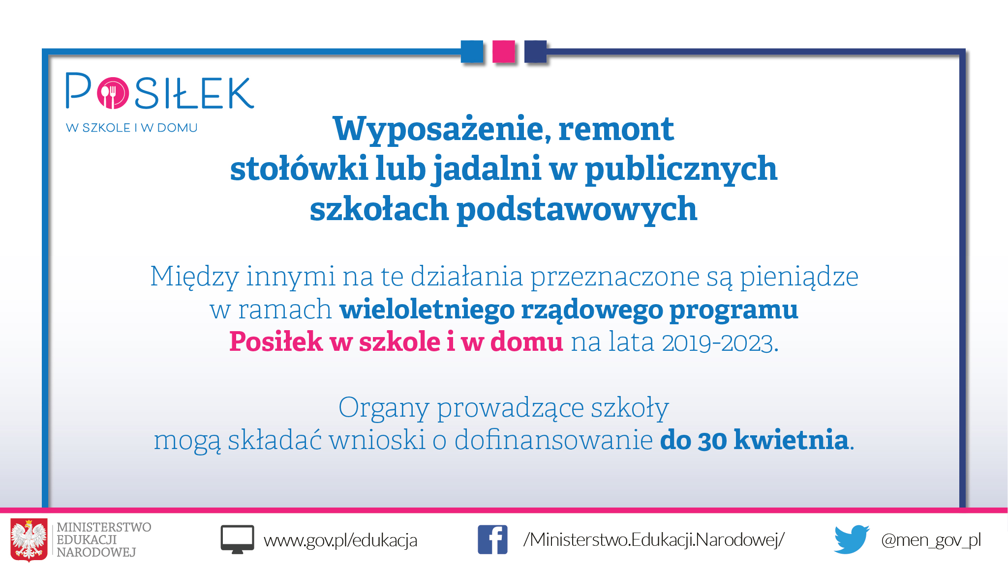 Rozporządzenie Rady Ministrów z dnia 5 lutego 2019 r. w sprawie realizacji modułu 3 wieloletniego rządowego programu "Posiłek w szkole i w domu" dotyczącego wspierania w latach 2019-2023 organów prowadzących publiczne szkoły podstawowe w zapewnieniu bezpiecznych warunków nauki, wychowania i opieki przez organizację stołówek i miejsc spożywania posiłków http://prawo.sejm.gov.pl/isap.nsf/DocDetails.xsp?id=WDU20190000267