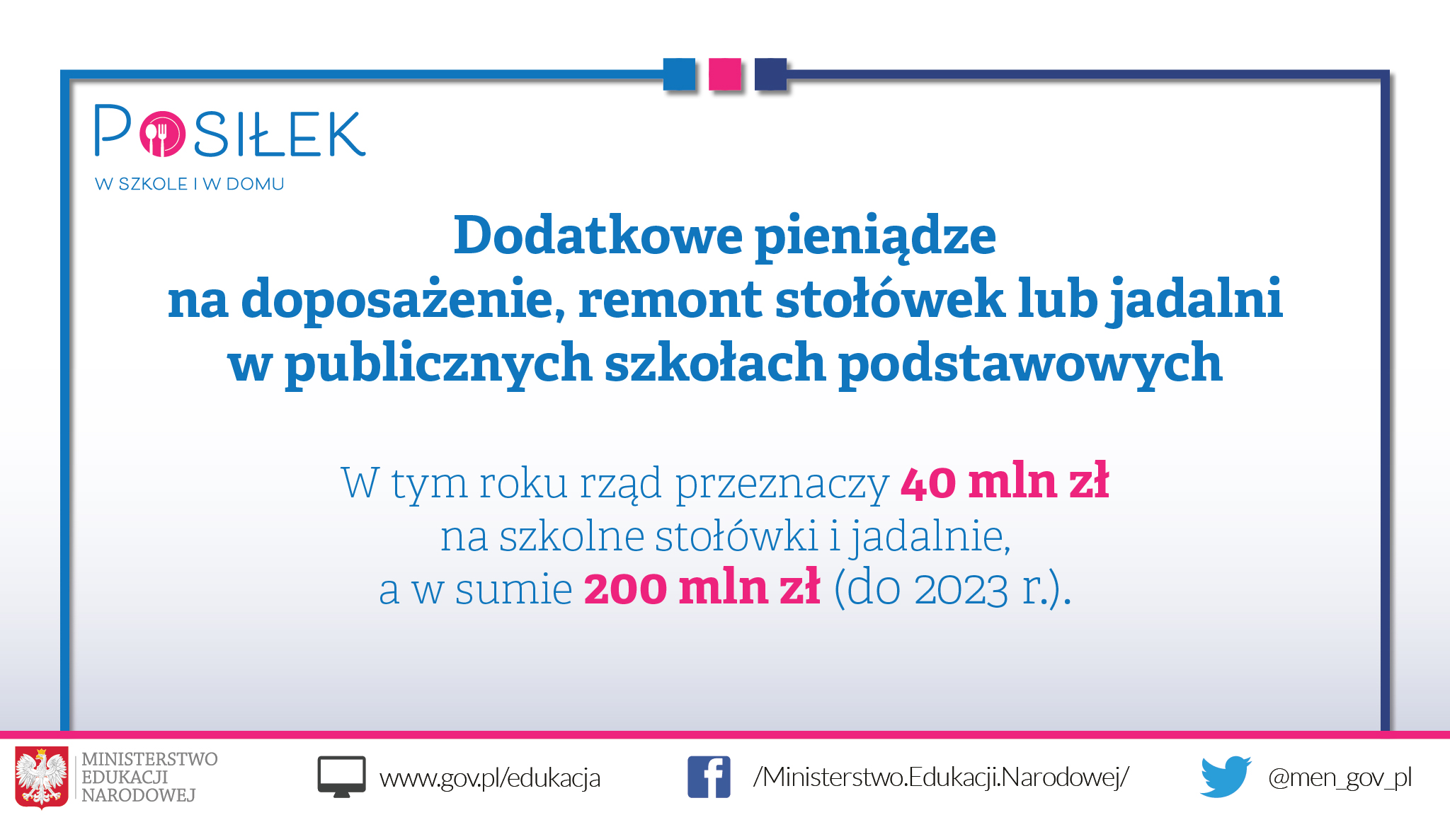 Rząd przeznaczy na szkolne stołówki i jadalnie 200 mln zł (po 40 mln zł rocznie). Wyposażenie, remont stołówki lub jadalni w publicznych szkołach podstawowych – to między innymi na te działania są pieniądze w ramach Wieloletniego Rządowego Programu Posiłek w szkole i w domu na lata 2019-2023. Wnioski o dofinansowanie organy prowadzące szkoły mogą składać do wojewodów do 30 kwietnia danego roku. Rada ministrów przyjęła 5 lutego br., projekt rozporządzenia w sprawie realizacji modułu 3 wieloletniego rządowego programu „Posiłek w szkole i w domu”.