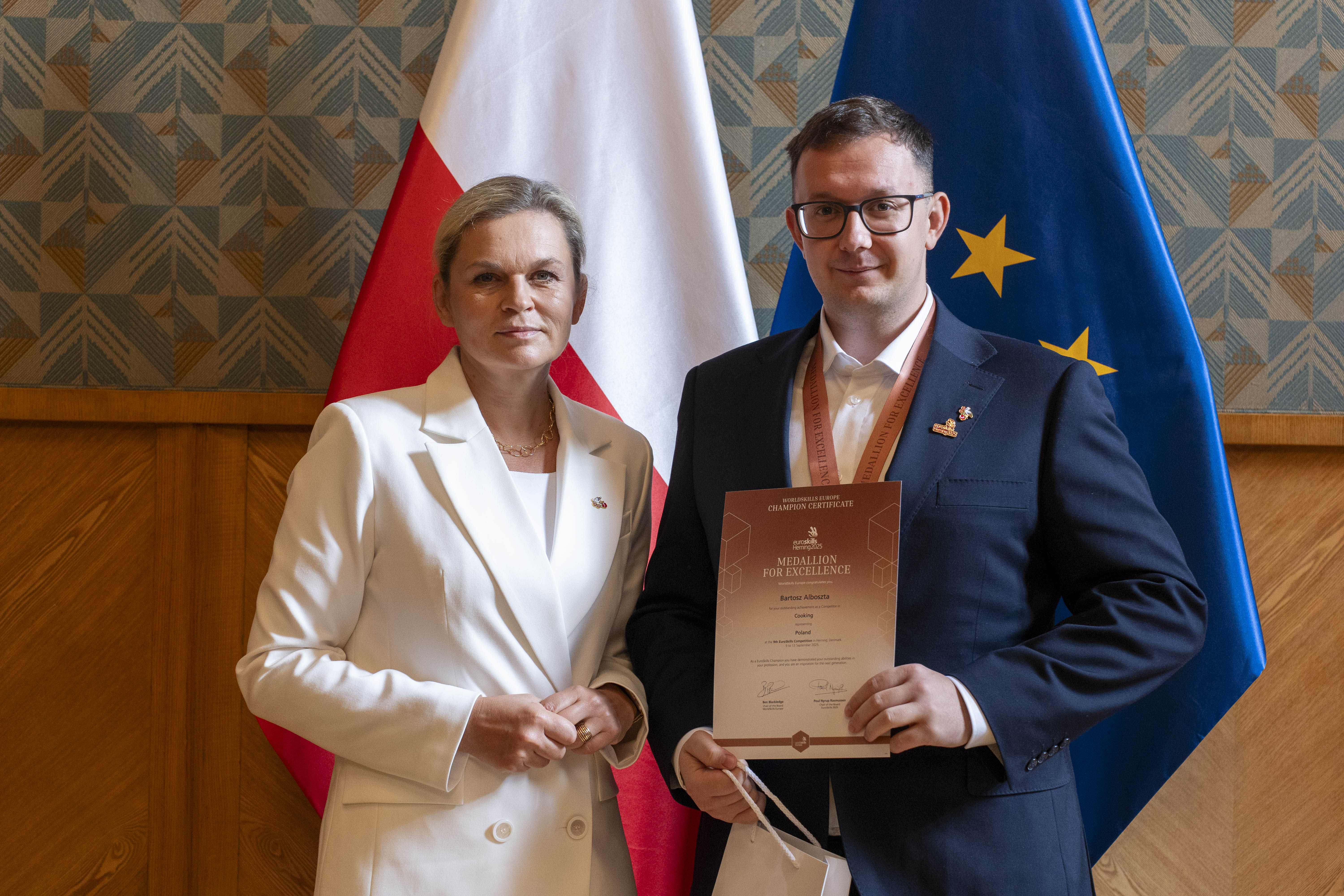 Minister Edukacji Barbara Nowacka spotkała się dziś w Ministerstwie Edukacji Narodowej z członkami polskiej drużyny EuroSkills Herning 2025, którzy otrzymali medale doskonałości za wyróżniające się wyniki w konkursie umiejętności zawodowych. Wśród nagrodzonych znaleźli się m.in. Bartosz Alboszta (gotowanie), Witold Mondry (piekarstwo), Julia Łukańko (fryzjerstwo), Marcel Kwaśniewski (elektronika) oraz Jakub Świtała (frezowanie CNC).