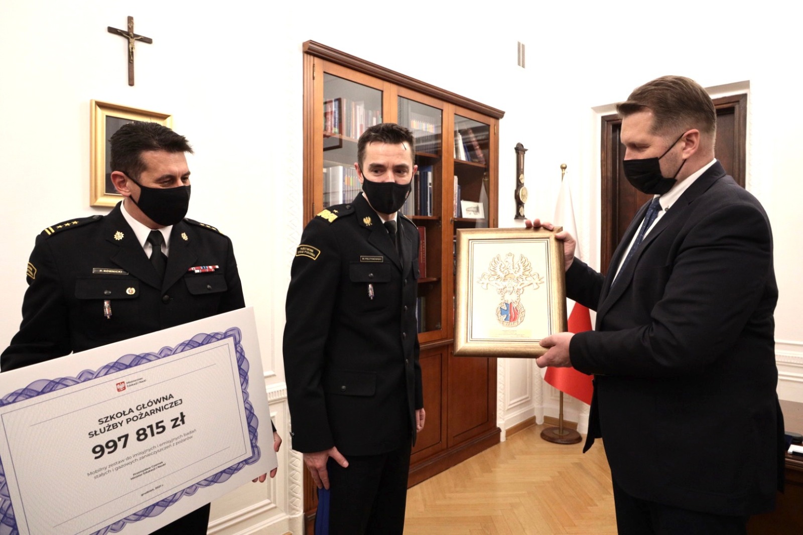 Minister Przemysław Czarnek przekazał SGSP czek na zakup specjalistycznej aparatury wykorzystywanej podczas pożarów
