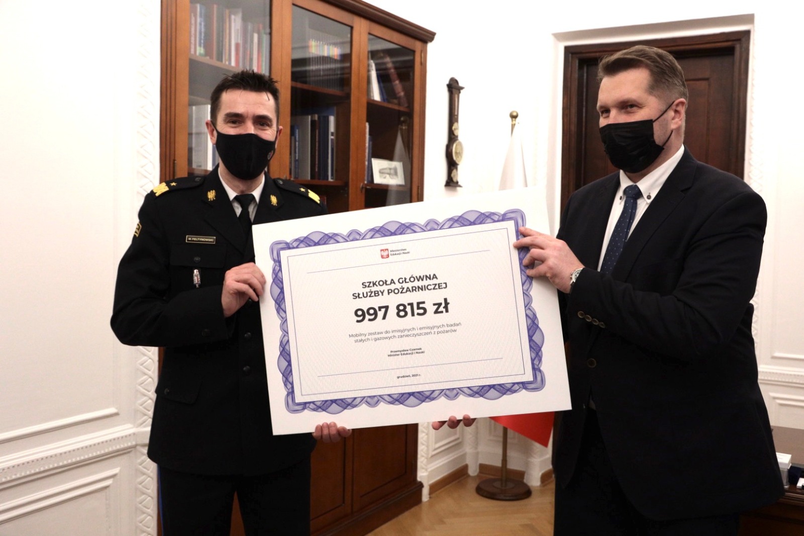 17 grudnia br. Minister Edukacji i Nauki Przemysław Czarnek wręczył Szkole Głównej Służby Pożarniczej czek na zakup specjalistycznej aparatury wykorzystywanej podczas gaszenia pożarów.
