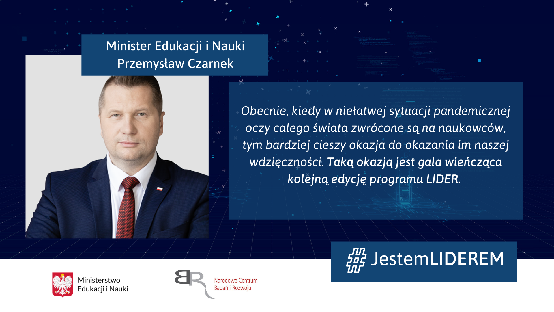 - Obecnie, kiedy w niełatwej sytuacji pandemicznej oczy całego świata zwrócone są na naukowców, tym bardziej cieszy okazja do okazania im naszej wdzięczności. Taką okazją jest gala wieńcząca kolejną edycję programu LIDER. Wyróżnienie to dla laureatów nie tylko sposób na dążenie do doskonałości naukowej, rozwoju kariery, ale możliwość zbudowania całego zespołu wokół własnego konceptu badań – powiedział Minister Edukacji i Nauki Przemysław Czarnek. - Planowanie i zarządzanie projektami naukowymi, komercjalizacja wyników to ogromna odpowiedzialność i szansa zawodowa. Potwierdzają to sukcesy zwycięzców poprzednich edycji konkursu. Jestem pewien, że nagradzani laureaci także tę szansę z powodzeniem wykorzystają – dodał minister.