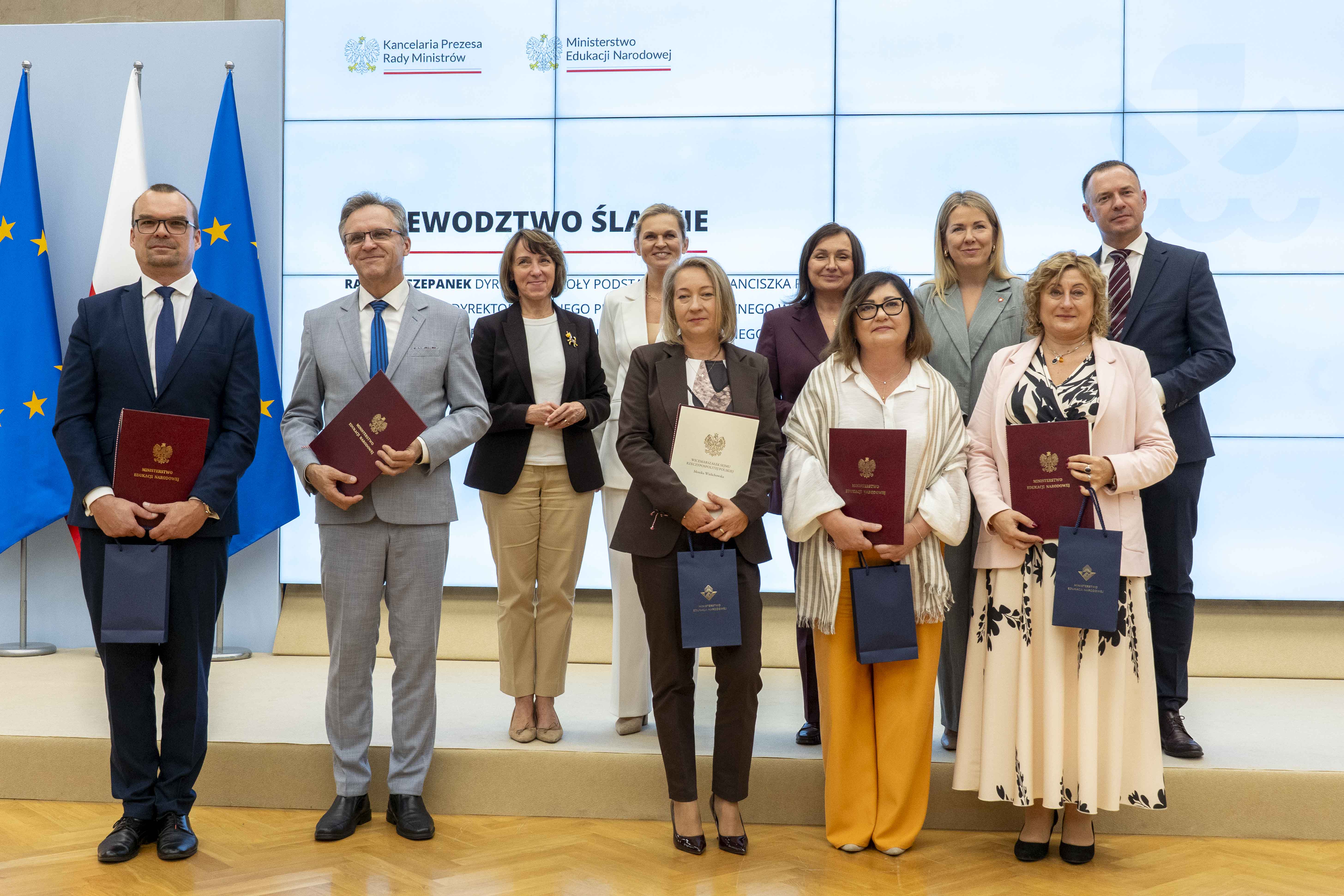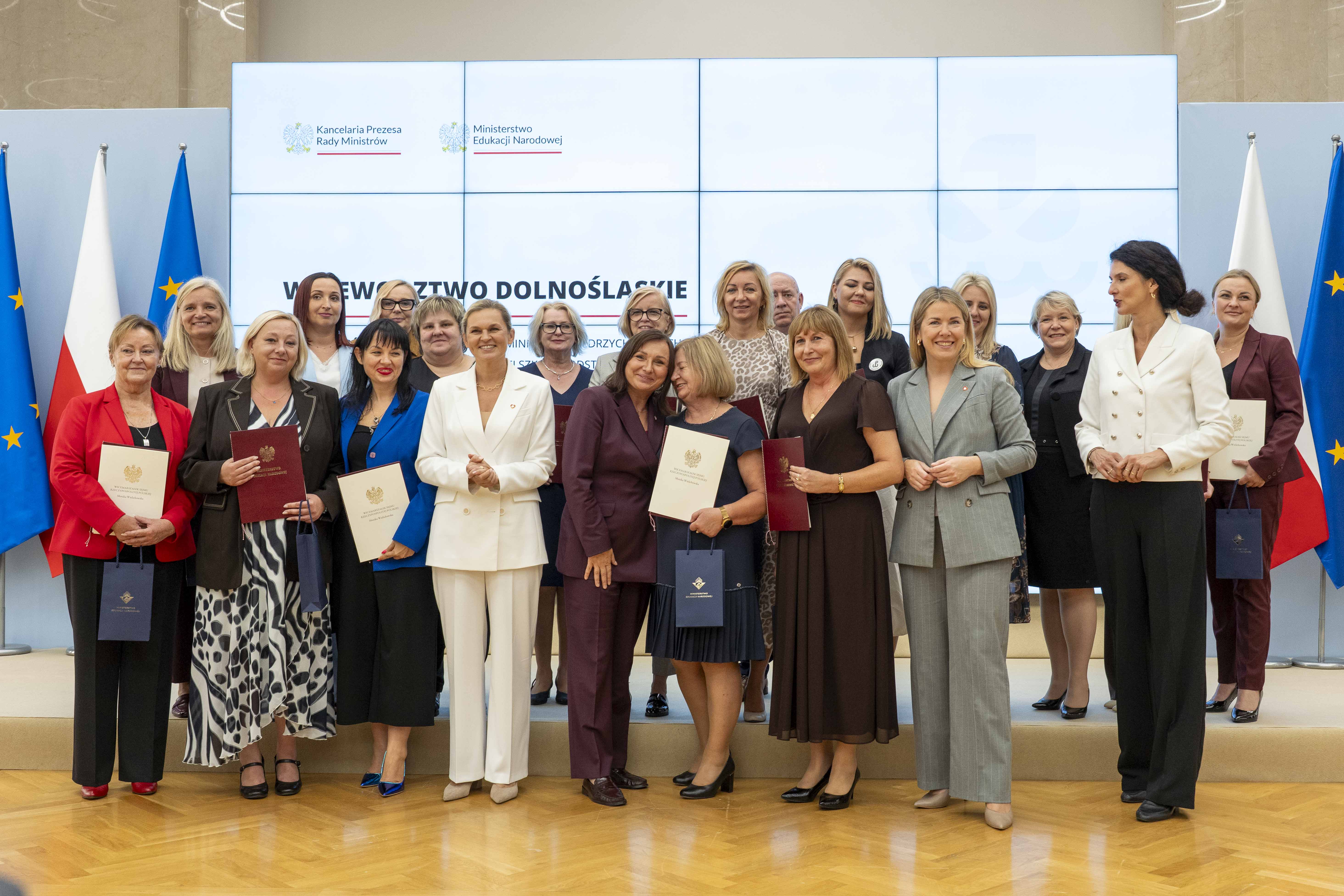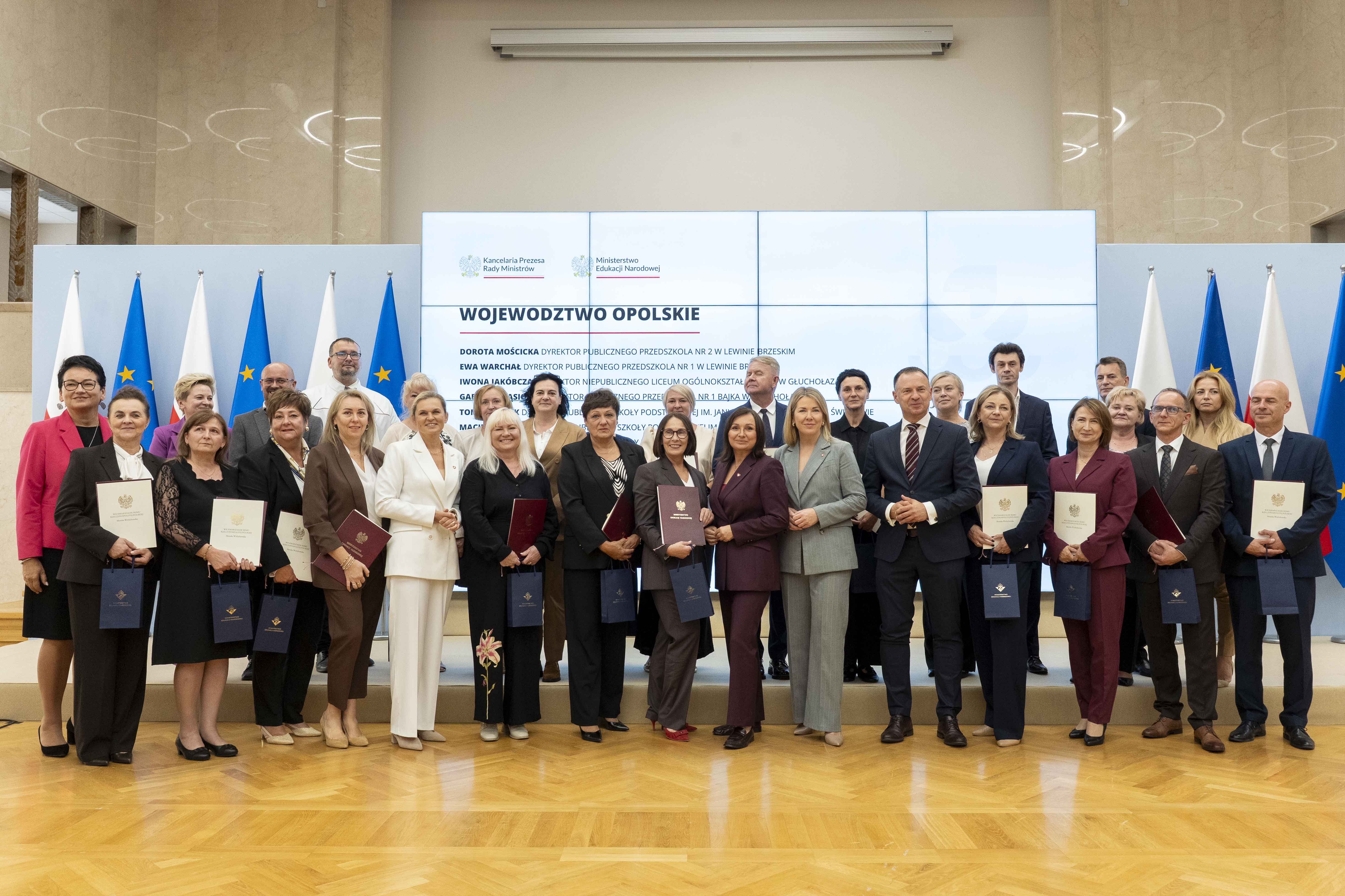 Na podstawie art. 49 ust. 1 pkt 3 ustawy z dnia 26 stycznia 1982 r. – Karta Nauczyciela (Dz. U. z 2024 r. poz. 986) w związku z § 9 rozporządzenia Ministra Edukacji Narodowej z dnia 10 sierpnia 2009 r. w sprawie kryteriów i trybu przyznawania nagród dla nauczycieli (Dz. U. z 2023 r. poz. 1258), w uznaniu szczególnych zasług w pracy dydaktycznej, wychowawczej i opiekuńczej nagrody otrzymało 56 dyrektorów z czterech województw: dolnośląskiego – 18 osób, lubuskiego – 6 osób, opolskiego – 27 osób i śląskiego – 5 osób.