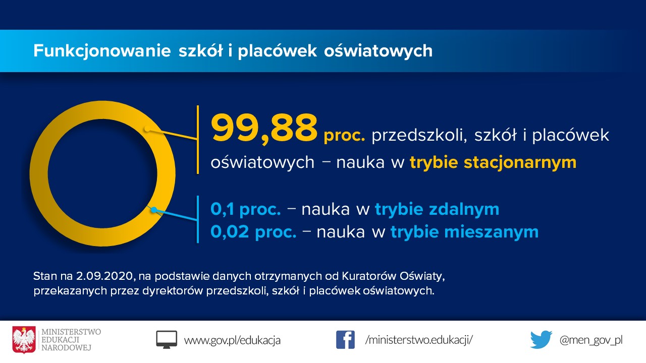 Wczoraj, 2 września, zgodnie z informacjami uzyskanymi od kuratorów oświaty na podstawie danych od dyrektorów, na ponad 48,5 tys. szkół i przedszkoli, w trybie mieszanym pracuje jedynie 12 placówek (tj. 0,02 %.). W 47 przypadkach w skali całego kraju nauka realizowana jest w trybie zdalnym (tj. 0,1 %). To zgłoszenia dotyczące placówek, w których powiatowa inspekcja sanitarna – po szczegółowym przeanalizowaniu sytuacji – wydała pozytywną zgodę na pracę szkoły w innym, niż stacjonarny tryb nauki.