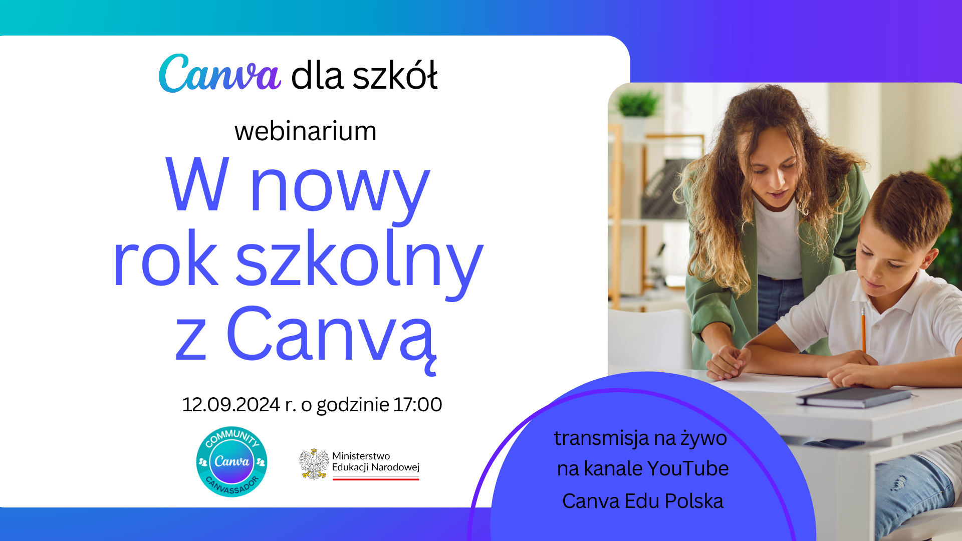 Ministerstwo Edukacji Narodowej we współpracy z Canvą oraz ambasadorami Canvy w Polsce zaprasza wszystkich nauczycieli i dyrektorów szkół do udziału w wyjątkowym wydarzeniu online: „Nowy rok szkolny z Canvą”, które odbędzie się 12 września o godzinie 17:00.