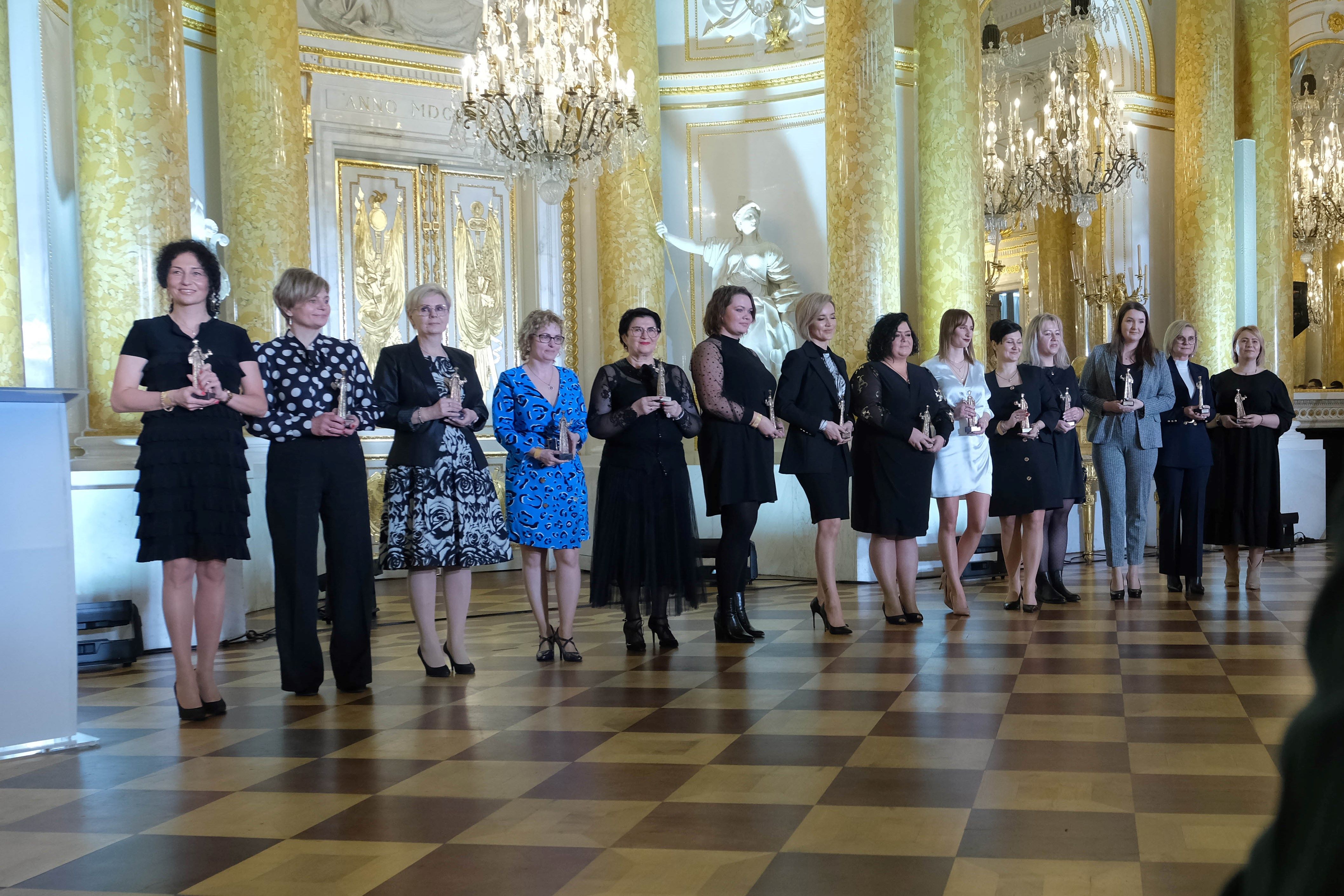 Grupa kobiet i mężczyzn stoi w rzędzie ze statuetkami w rękach. Przed nimi osoby siedzą na krzesłach i robią zdjęcia.