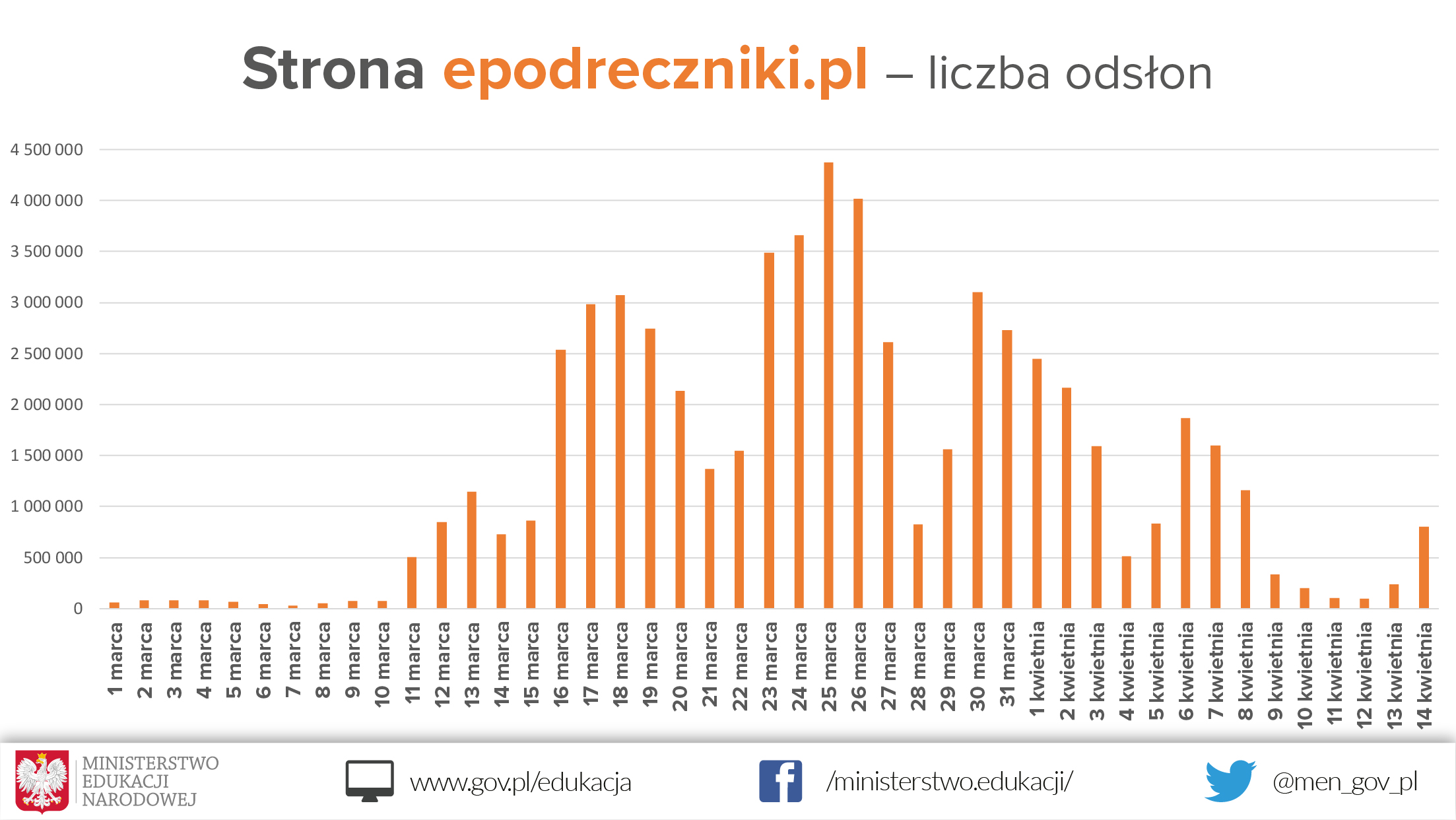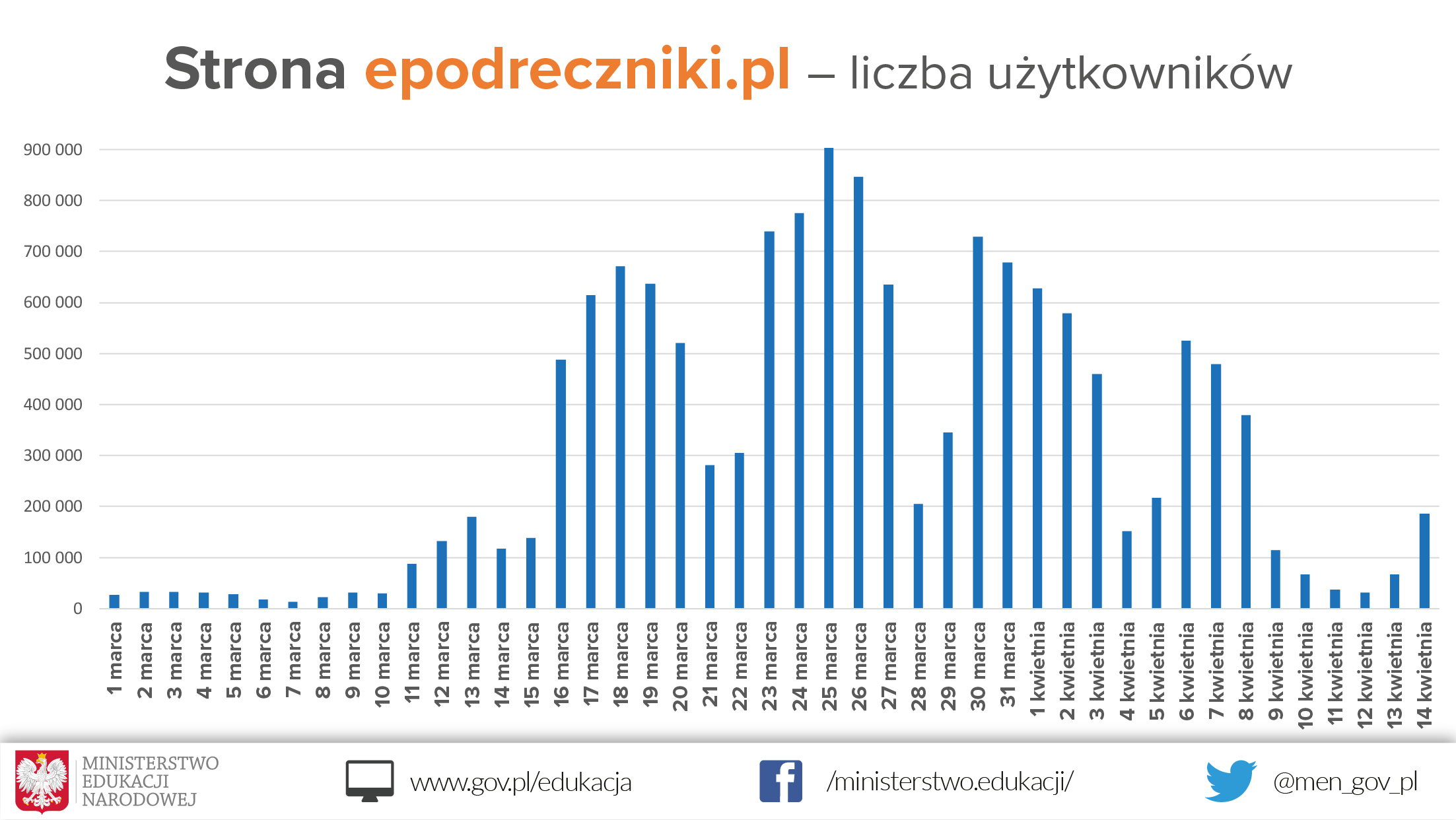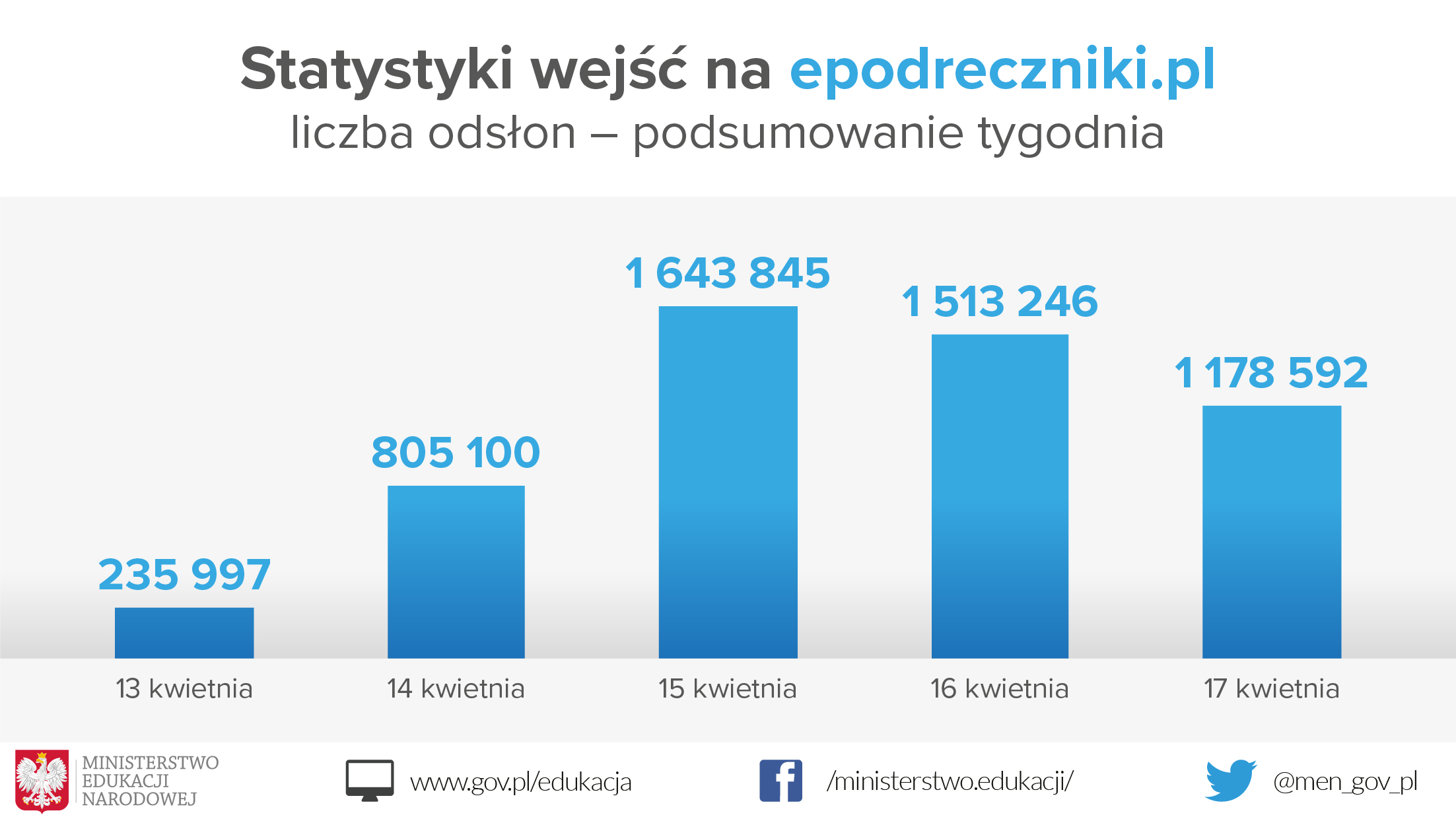Około pół miliona unikalnych użytkowników i prawie 2 miliony odsłon dziennie na platformie edukacyjnej epodreczniki.pl. Dziękujemy za tak duże zainteresowanie uczniów i nauczycieli, którzy chętnie korzystają z materiałów rekomendowanych przez MEN.