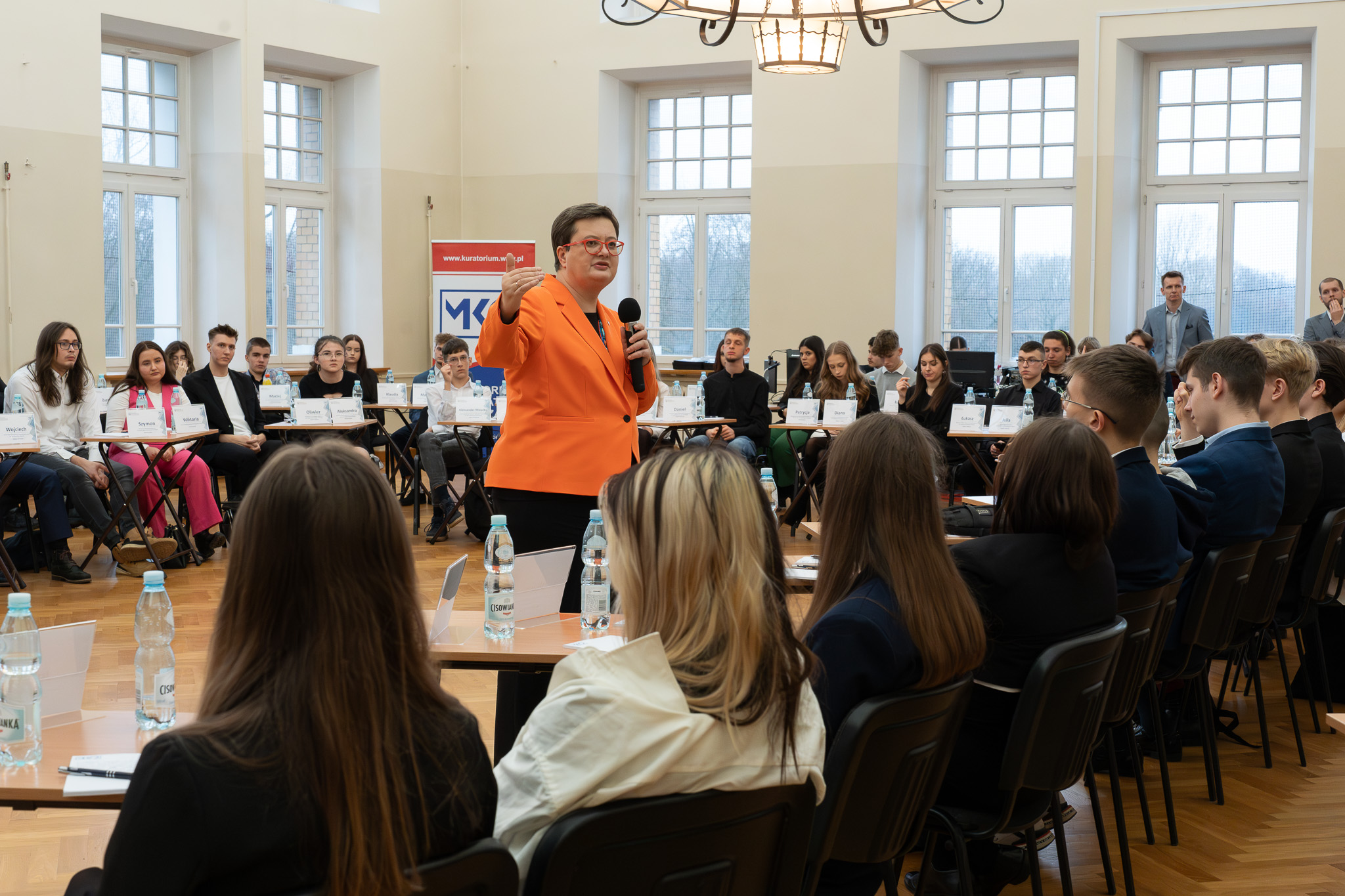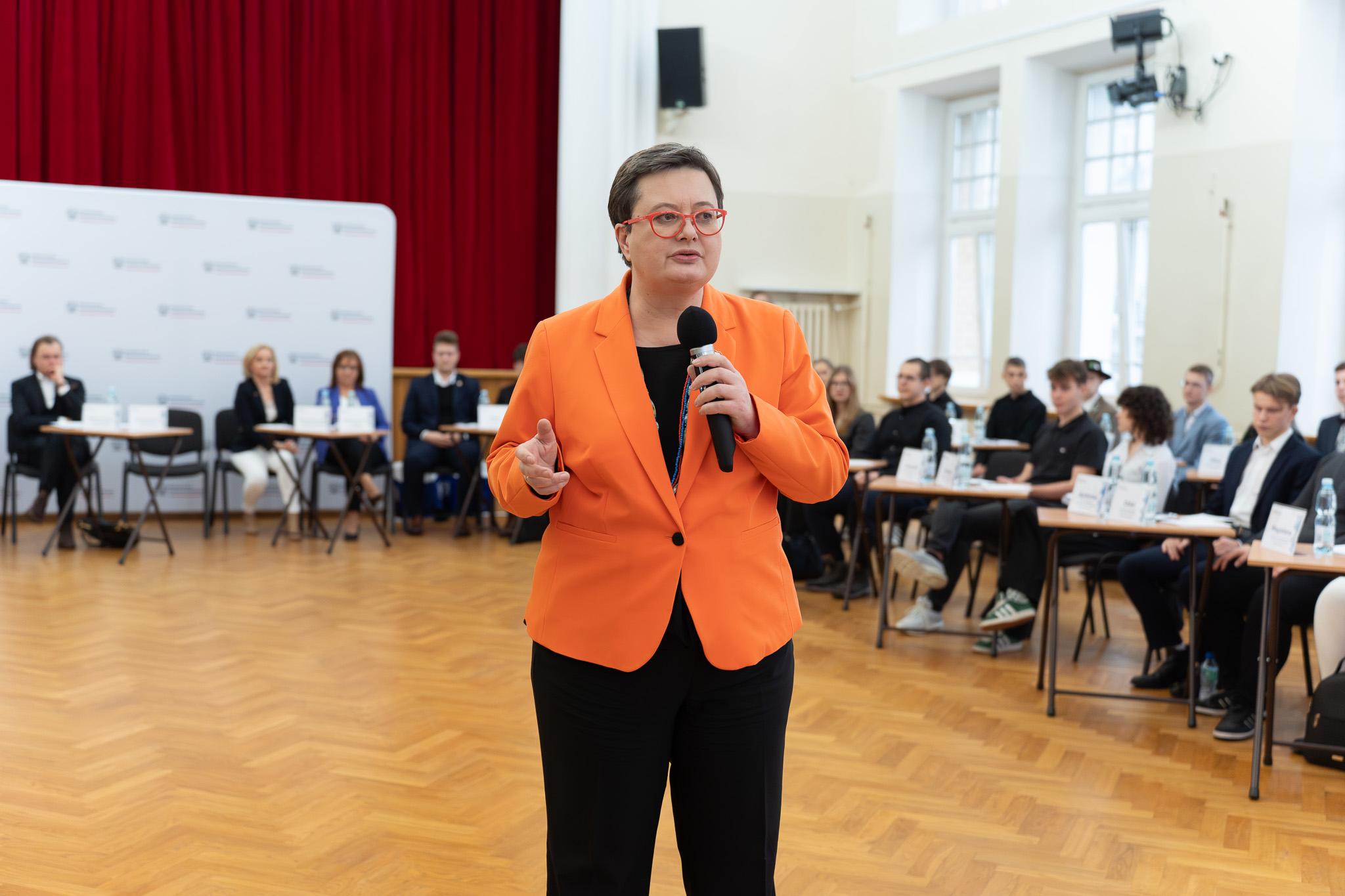 Wiceminister Katarzyna Lubnauer rozmawiała z uczniami o przyszłości szkoły, o tym co ich zdaniem powinno się zmieć w edukacji. Młodzież dzieliła się swoimi uwagami i propozycjami dotyczącymi różnych aspektów edukacji, w tym podstawy programowej, organizacji zajęć, roli nowych technologii w procesie kształcenia.