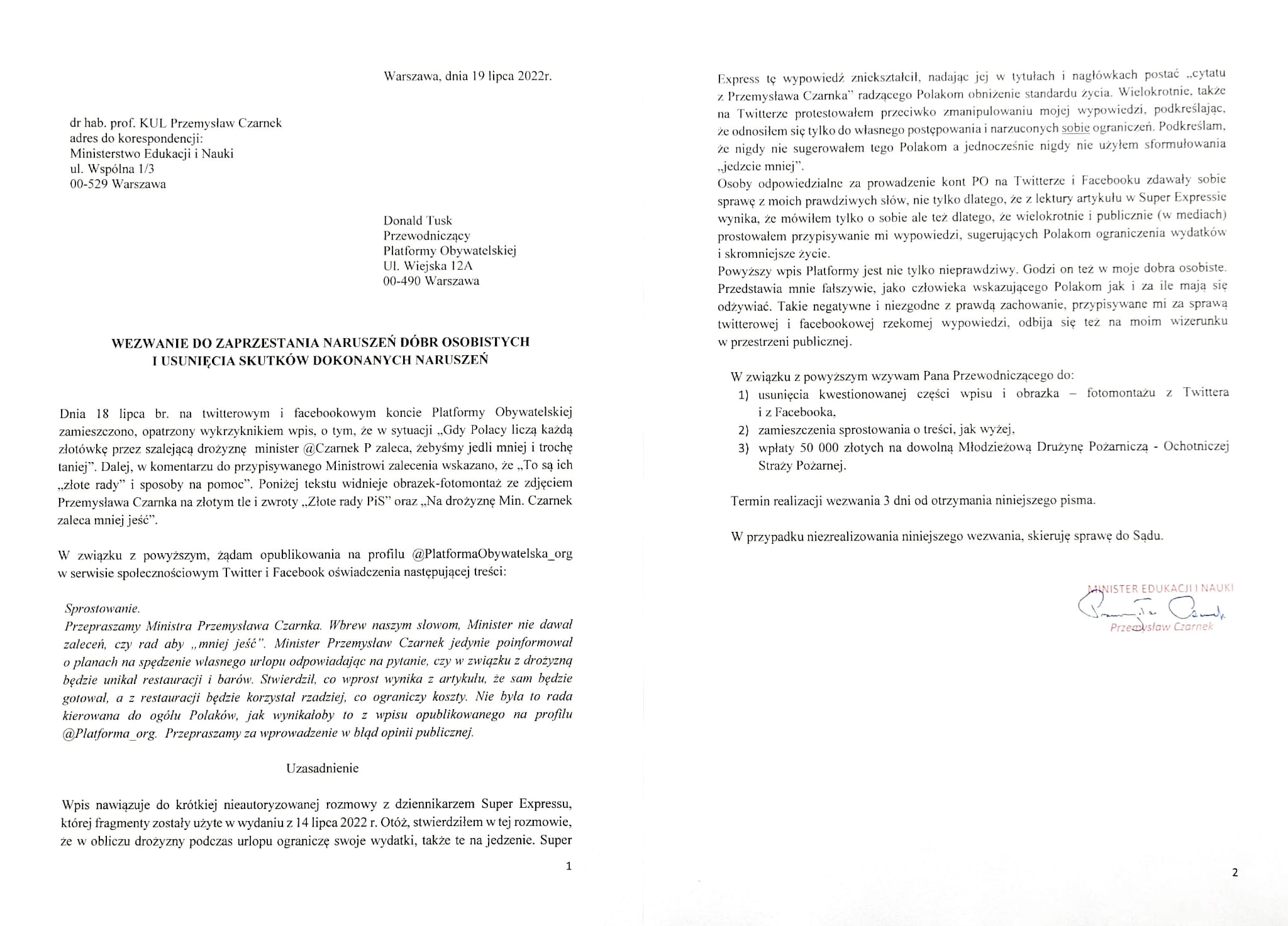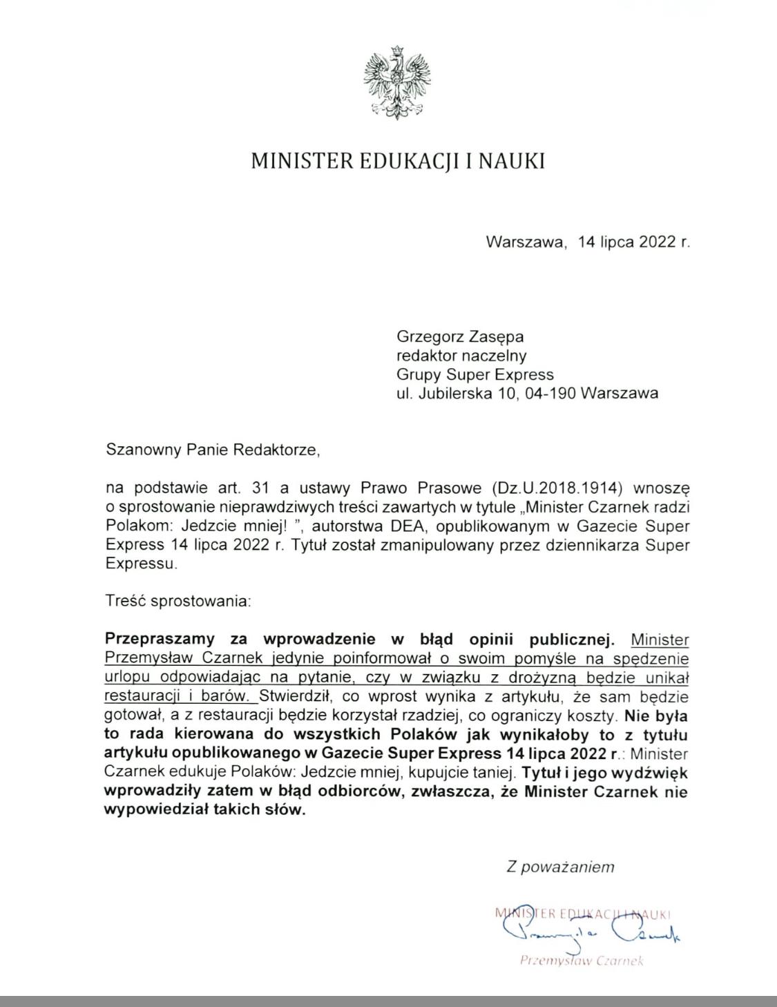 W przestrzeni medialnej pojawiają się informacje nawiązujące do nieautoryzowanej rozmowy szefa MEiN z dziennikarzem „Super Expressu”. Prezentują one w zupełnie innym kontekście słowa, których minister Przemysław Czarnek użył do opisania swoich planów urlopowych. Fragment wypowiedzi szefa MEiN został zniekształcony i przedstawiony jako cytat dotyczący sposobów na walkę z wysokimi cenami.