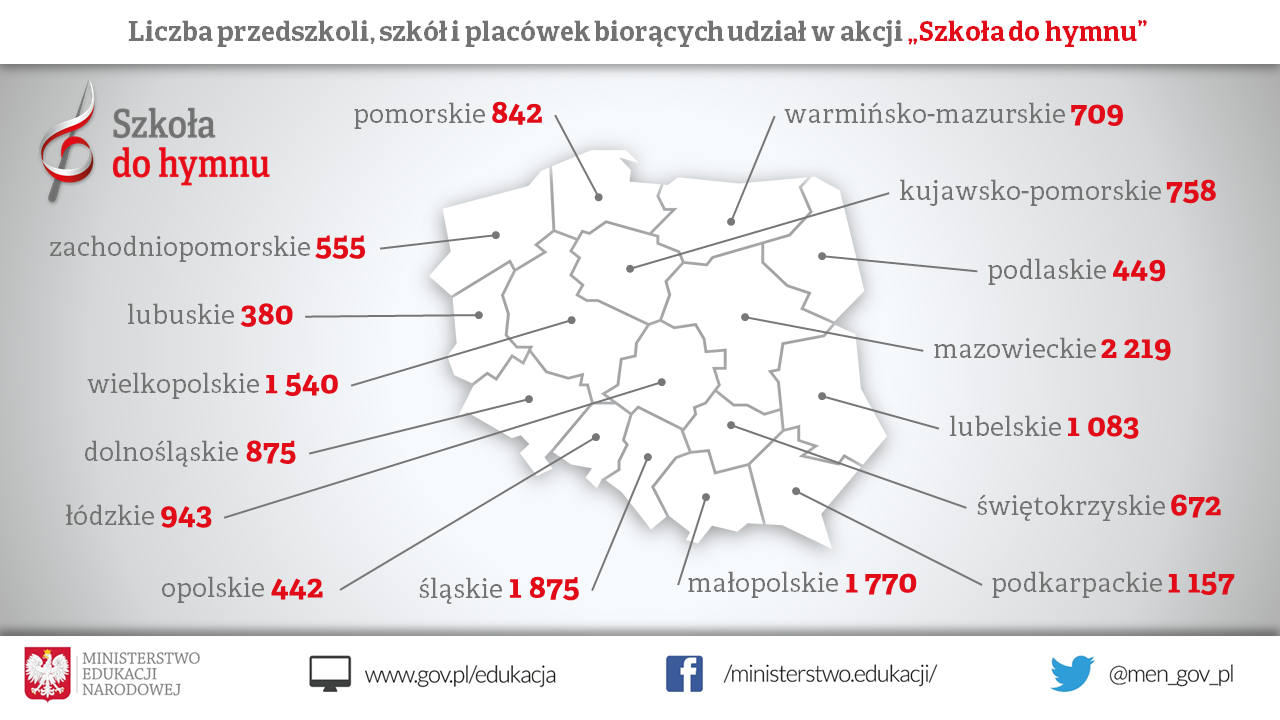 Łącznie do akcji „Szkoła do hymnu” przyłączyło się w 2020 r. 16 269 szkół, przedszkoli i placówek oświatowych z całego kraju. Najwięcej z województw: mazowieckiego (2 219), śląskiego (1 875), małopolskiego (1 770), wielkopolskiego (1 540), podkarpackiego (1 157) i lubelskiego (1 083).