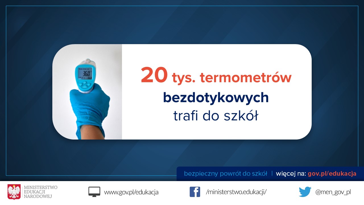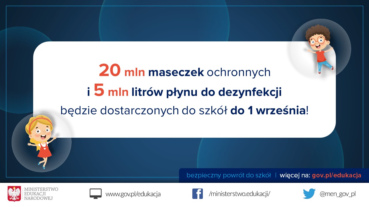 Minister Dariusz Piontkowski poinformował, że rząd wspiera dyrektorów i organy prowadzące w zapewnieniu dodatkowych środków ochrony dla szkół. Do tej pory do szkół i placówek oświatowych trafiło ponad 17 tys. dyspenserów. Blisko 19 tys. szkół złożyło już także zamówienia na płyn do dezynfekcji i maski medyczne. Do 1 września br. do szkół trafi 1 tura przewidzianych dostaw, czyli 20 mln maseczek ochronnych i 5 mln litrów płynu do dezynfekcji. W ramach dodatkowego wsparcia do szkół przekazanych będzie również 20 tys. termometrów bezdotykowych.