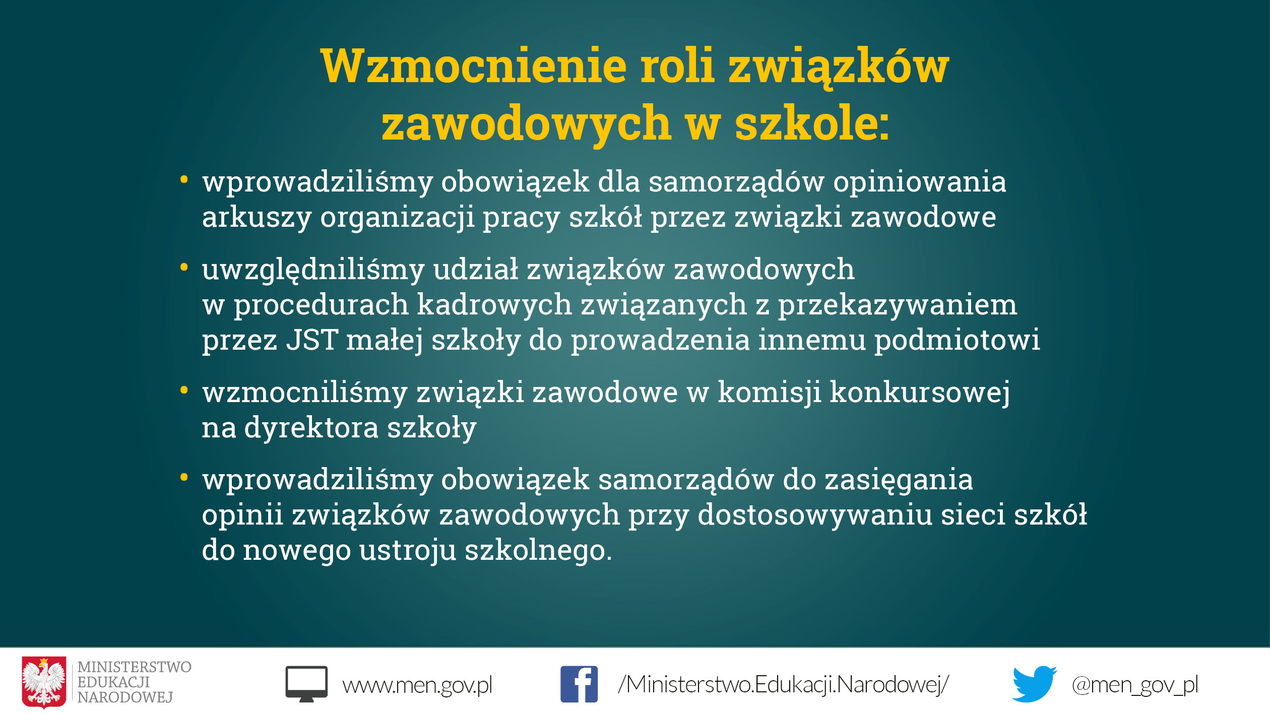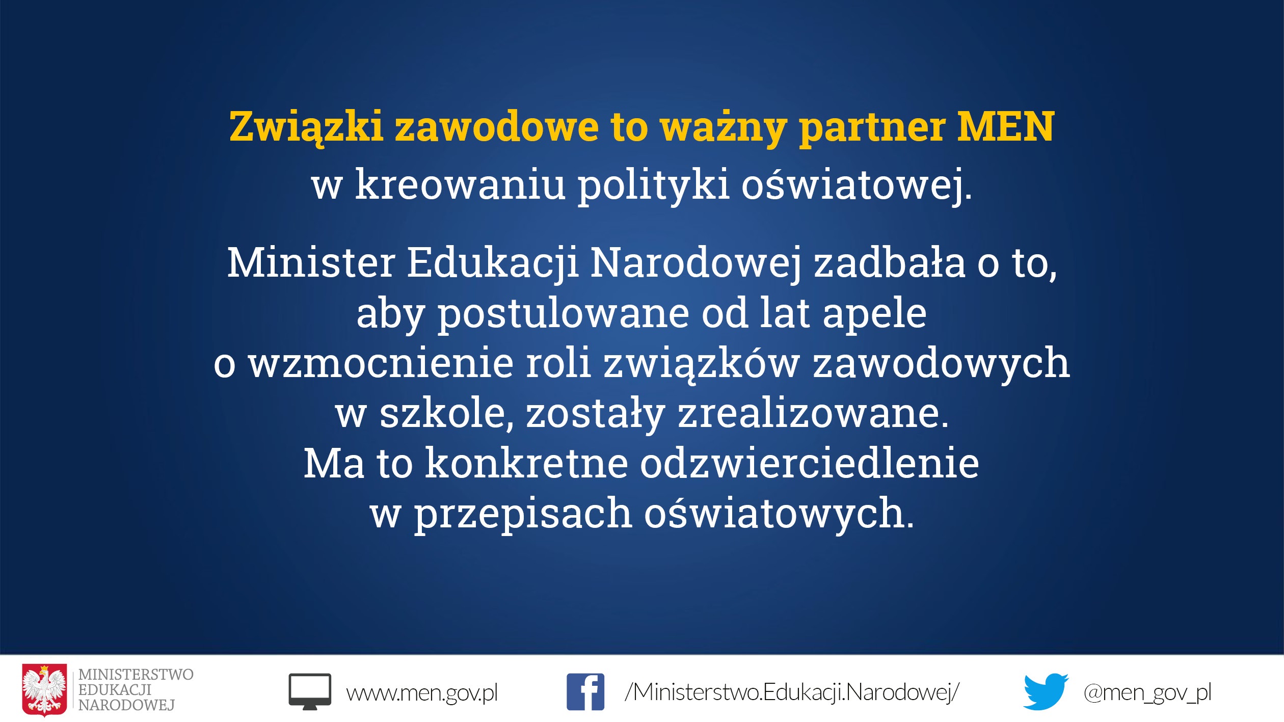 Związki zawodowe to ważny partner MEN w kreowaniu krajowej, lokalnej polityki oświatowej, a także w zakresie wprowadzania rozwiązań w jednostkach systemu oświaty. Minister Edukacji Narodowej zadbała o to, aby postulowane od lat apele o wzmocnienie roli związków zawodowych w szkole zostały zrealizowane. Ma to konkretne odzwierciedlenie w przepisach oświatowych.