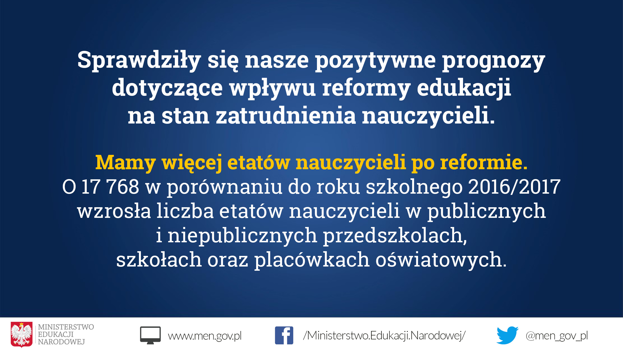 Mamy więcej etatów nauczycieli po reformie. Zahamowaliśmy zwolnienia. Sprawdziły się nasze pozytywne prognozy odnośnie wpływu reformy edukacji na stan zatrudnienia nauczycieli. W poprzednim roku szkolnym 2017/2018 było więcej nauczycieli zatrudnionych w szkołach i placówkach oświatowych, a także więcej etatów. O 17 768 w porównaniu do roku szkolnego 2016/2017 wzrosła liczba etatów nauczycieli w publicznych i niepublicznych przedszkolach, szkołach oraz placówkach. Po reformie wzrósł średni wymiar etatu przypadający na nauczyciela niepełnozatrudnionego. W roku szkolnym 2016/2017 nauczyciel niepełnozatrudniony pracował w wymiarze średnio 0,865 etatu, a w roku szkolnym 2017/2018 0,923 etatu (wzrost aż o 6,7%). Liczba etatów nauczycieli wzrosła o 17 768 etatów, z czego o 17 476 etatów wzrosła liczba etatów nauczycieli pełnozatrudnionych, a jedynie 291 etatów dotyczy wzrostu etatów nauczycieli niepełnozatrudnionych. Podobnie, w przypadku wzrostu nauczycieli liczonych w osobach, jest o 10 139 nauczycieli więcej. Liczba nauczycieli pełnozatrudnionych (w osobach) wzrosła o 17 183, a niepełnozatrudnionych (w osobach) spadła o 7 044.