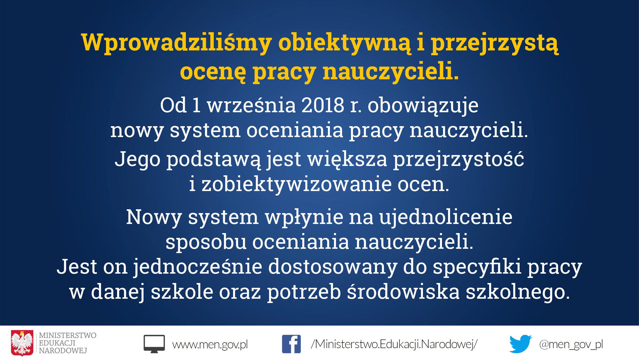 Wprowadziliśmy obiektywną i przejrzystą ocenę pracy nauczycieli. Od 1 września 2018 r. obowiązuje nowy system oceniania pracy nauczycieli. Jego podstawą jest większa przejrzystość i zobiektywizowanie ocen. Nowy system wpłynie na ujednolicenie sposobu oceniania, przy jednoczesnym dostosowaniu go do specyfiki pracy w danej szkole oraz potrzeb środowiska szkolnego.