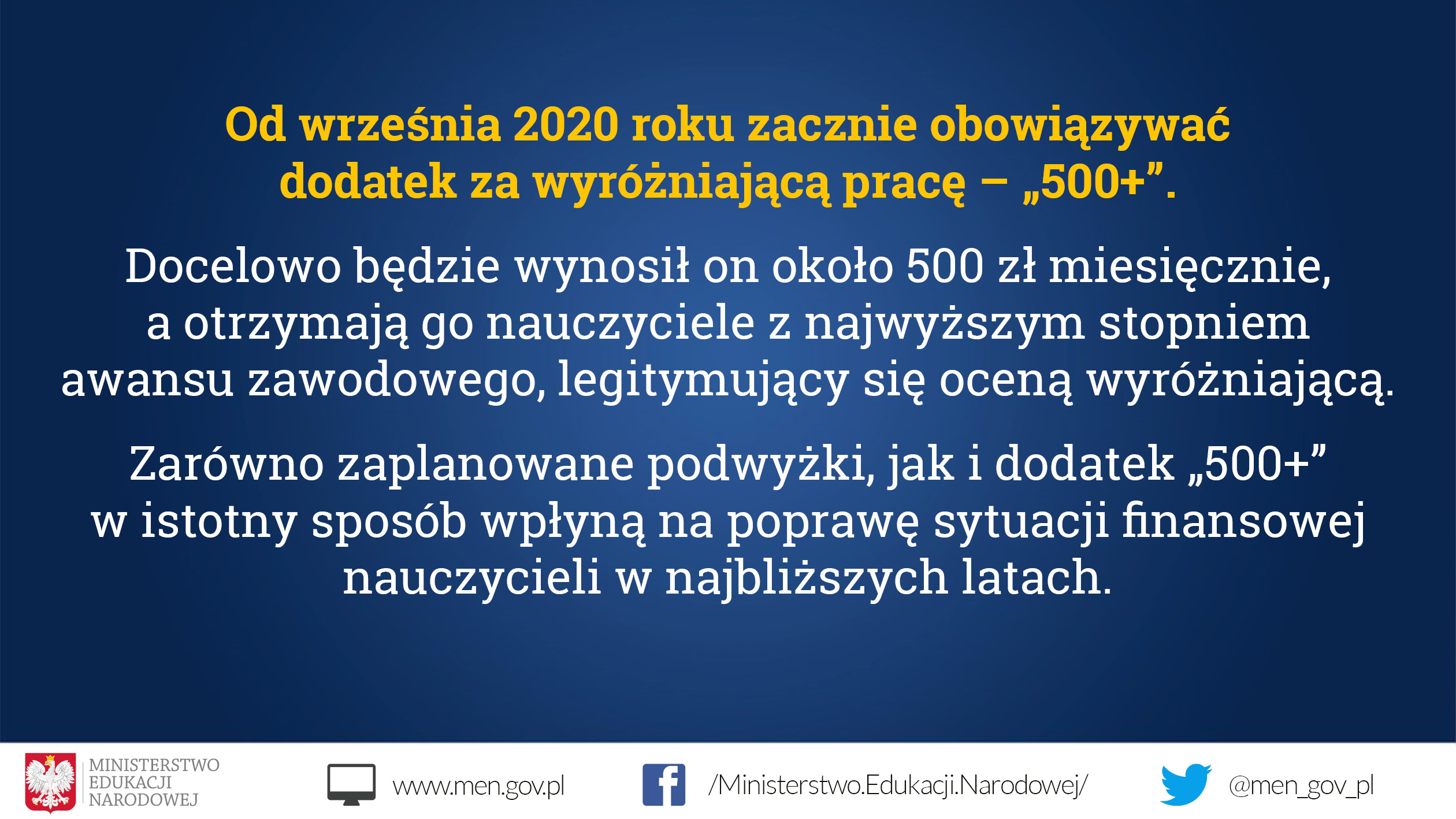 Wprowadziliśmy dodatek za wyróżniającą pracę – „500+”. Od września 2020 roku zacznie obowiązywać dodatek za wyróżniającą pracę. Docelowo będzie wynosił około 500 zł miesięcznie, a otrzymają go nauczyciele z najwyższym stopniem awansu zawodowego, legitymujący się oceną wyróżniającą. Zarówno zaplanowane podwyżki, jak i dodatek „500+” w istotny sposób wpłyną na poprawę sytuacji finansowej nauczycieli w najbliższych latach.