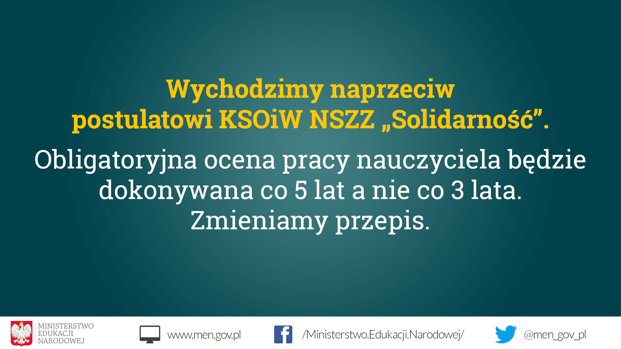 Każda zmiana wprowadza niepokój i niepewność. Rozumiemy to. Jesteśmy otwarci na dialog. Zależy nam by wspólnie wypracować jak najlepsze rozwiązania. Jeśli któryś z przepisów wymaga lub będzie wymagał korekty, zrobimy to. Jesteśmy otwarci. Przykładem jest wnioskowana przez KSOiW NSZZ „Solidarność” zmiana częstotliwości dokonywania obligatoryjnej oceny z 3 do 5 lat. Wychodzimy naprzeciw postulatowi Związku i zmieniamy to. Obligatoryjna ocena pracy nauczyciela będzie dokonywana co 5 lat.
