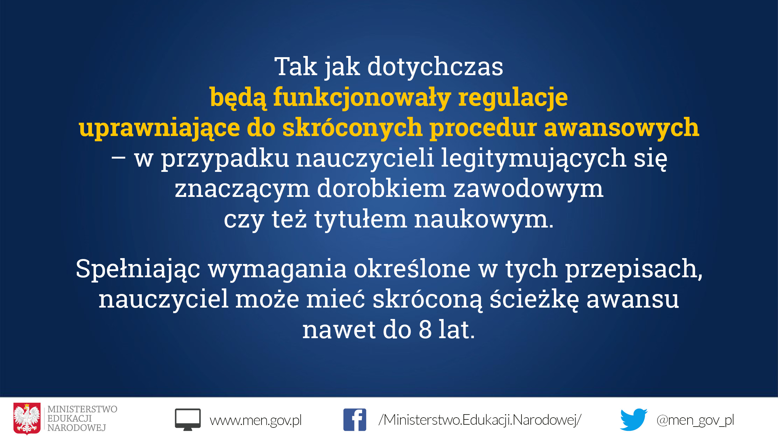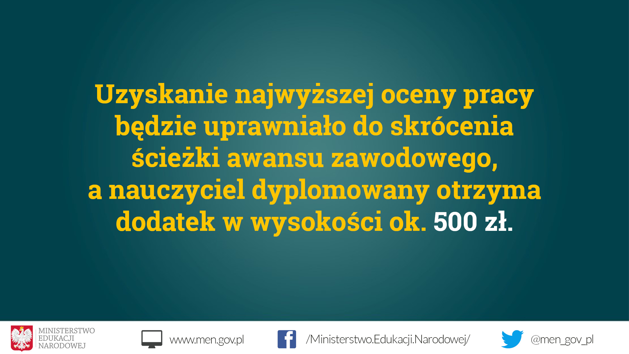 Uzyskanie najwyższej oceny pracy będzie uprawniało nauczyciela do skrócenia ścieżki awansu zawodowego. W przypadku nauczyciela dyplomowanego otwiera perspektywę awansu finansowanego, która dotychczas zamykała się po ok. 10 latach pracy w zawodzie, po uzyskaniu najwyższego stopnia awansu zawodowego. Tak jak dotychczas będą funkcjonowały regulacje uprawniające do skróconych procedur awansowych w przypadku nauczycieli legitymujących się znaczącym dorobkiem zawodowym, czy też tytułem naukowym. Spełniając wymagania określone w tych przepisach nauczyciel może mieć skróconą ścieżkę awansu nawet do 8 lat.