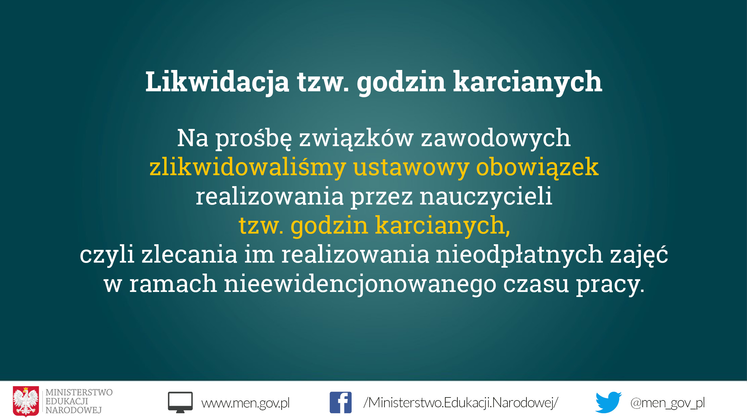 Zlikwidowaliśmy tzw. godziny karciane czyli ustawowy obowiązek realizowania przez nauczycieli tzw. godzin karcianych, czyli zlecania im realizowania nieodpłatnych zajęć w ramach nieewidencjonowanego czasu pracy.