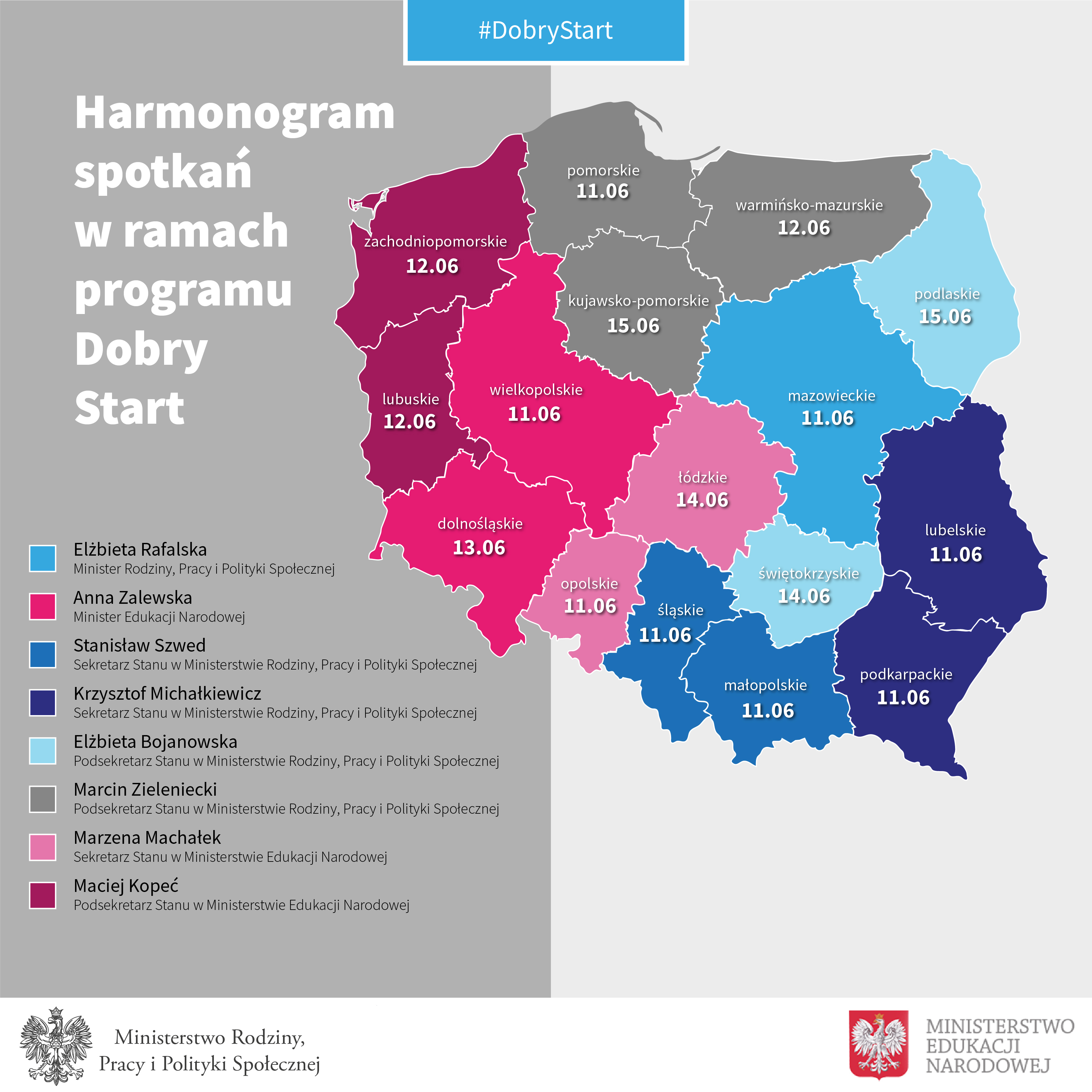 W dniach 11-15 czerwca br. w ramach kampanii informacyjnej dotyczącej rządowego programu „Dobry Start”, zaplanowany został cykl spotkań we wszystkich województwach z udziałem członków kierownictwa Ministerstwa Edukacji Narodowej i Ministerstwa Rodziny, Pracy i Polityki Społecznej.