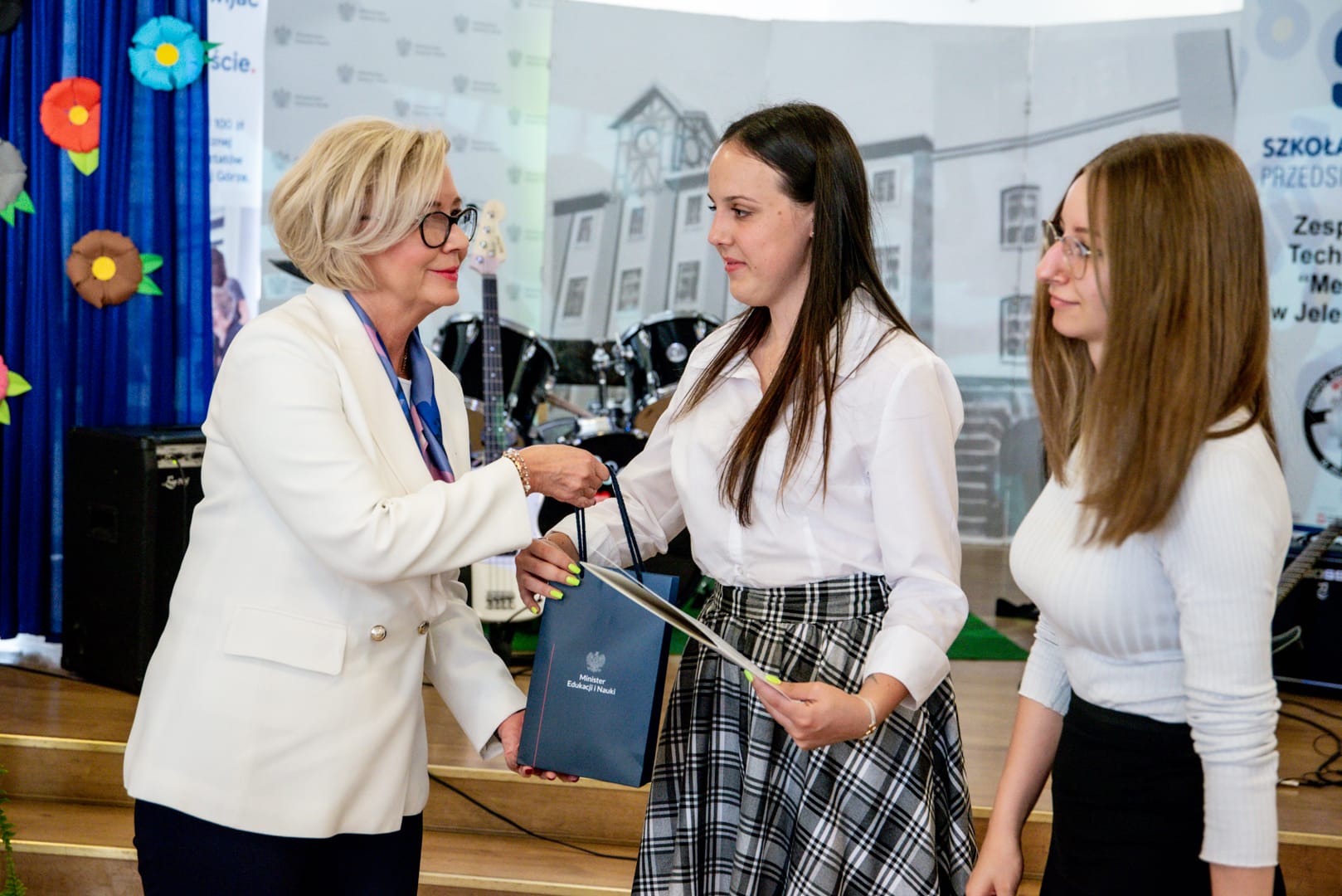 Wiceminister Marzena Machałek wzięła udział w zakończeniu roku szkolnego w Zespole Szkół Technicznych „Mechanik” w Jeleniej Górze. To nowoczesna placówka, która współpracuje z przedsiębiorcami w regionie i dostosuje ofertę kształcenia do potrzeb lokalnego rynku pracy. Podczas uroczystości Sekretarz Stanu w MEiN mówiła o rozwoju szkolnictwa branżowego oraz wychowawczej roli szkoły.