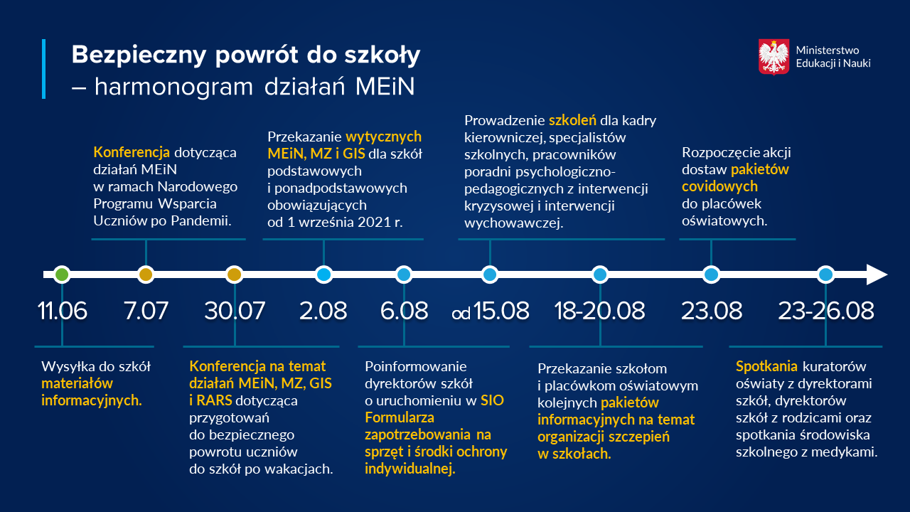 W ostatnim tygodniu sierpnia odbędą się spotkania kuratorów oświaty z dyrektorami szkół, dyrektorów szkół z rodzicami oraz spotkania środowiska szkolnego z medykami. Kuratorzy oświaty zorganizują konferencje online skierowane do dyrektorów szkół, w których będą uczestniczyli przedstawiciele podmiotów leczniczych. Konferencje będą dotyczyły programu szczepień nastolatków.