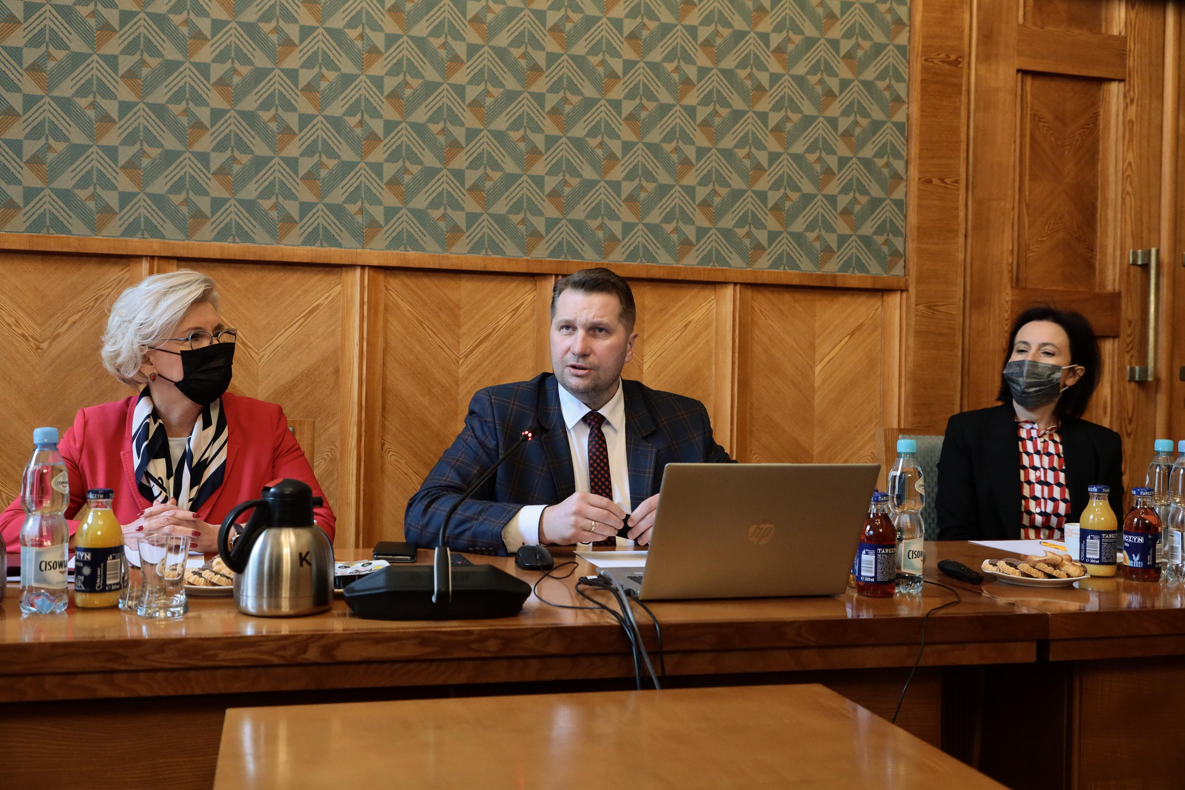 Dziś, 7 grudnia w gmachu Ministerstwa Edukacji i Nauki odbyło się kolejne posiedzenie Zespołu ds. statusu zawodowego pracowników oświaty, poświęcone propozycjom MEiN w zakresie pragmatyki zawodowej nauczycieli. W spotkaniu uczestniczyli minister Przemysław Czarnek i wiceminister Marzena Machałek, a także minister Bogna Janke z Kancelarii Prezydenta RP.