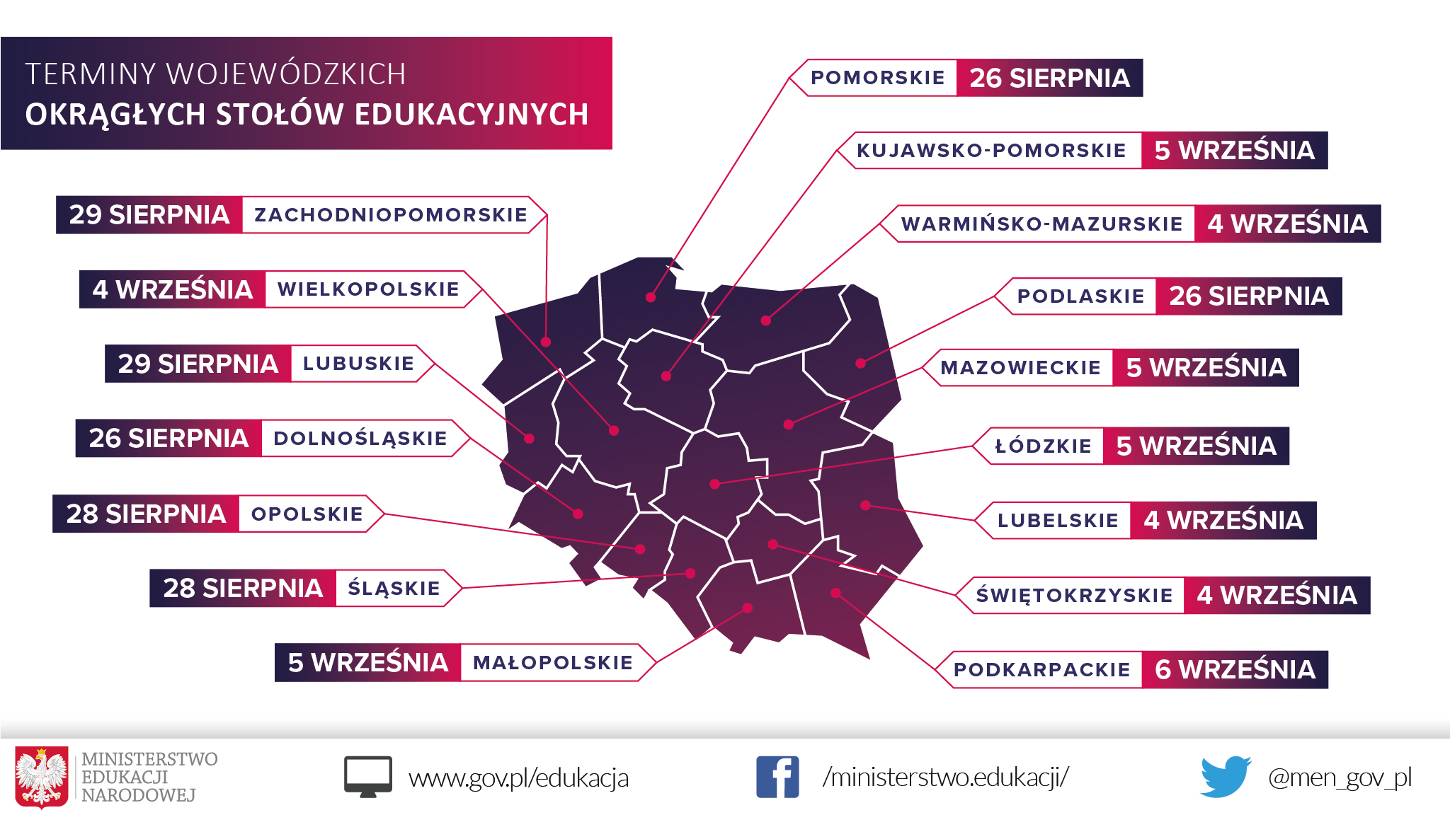 W poniedziałek, 26 sierpnia obędą się 3 regionalne stoły edukacyjne, w których wezmą udział minister edukacji i wiceministrowie.