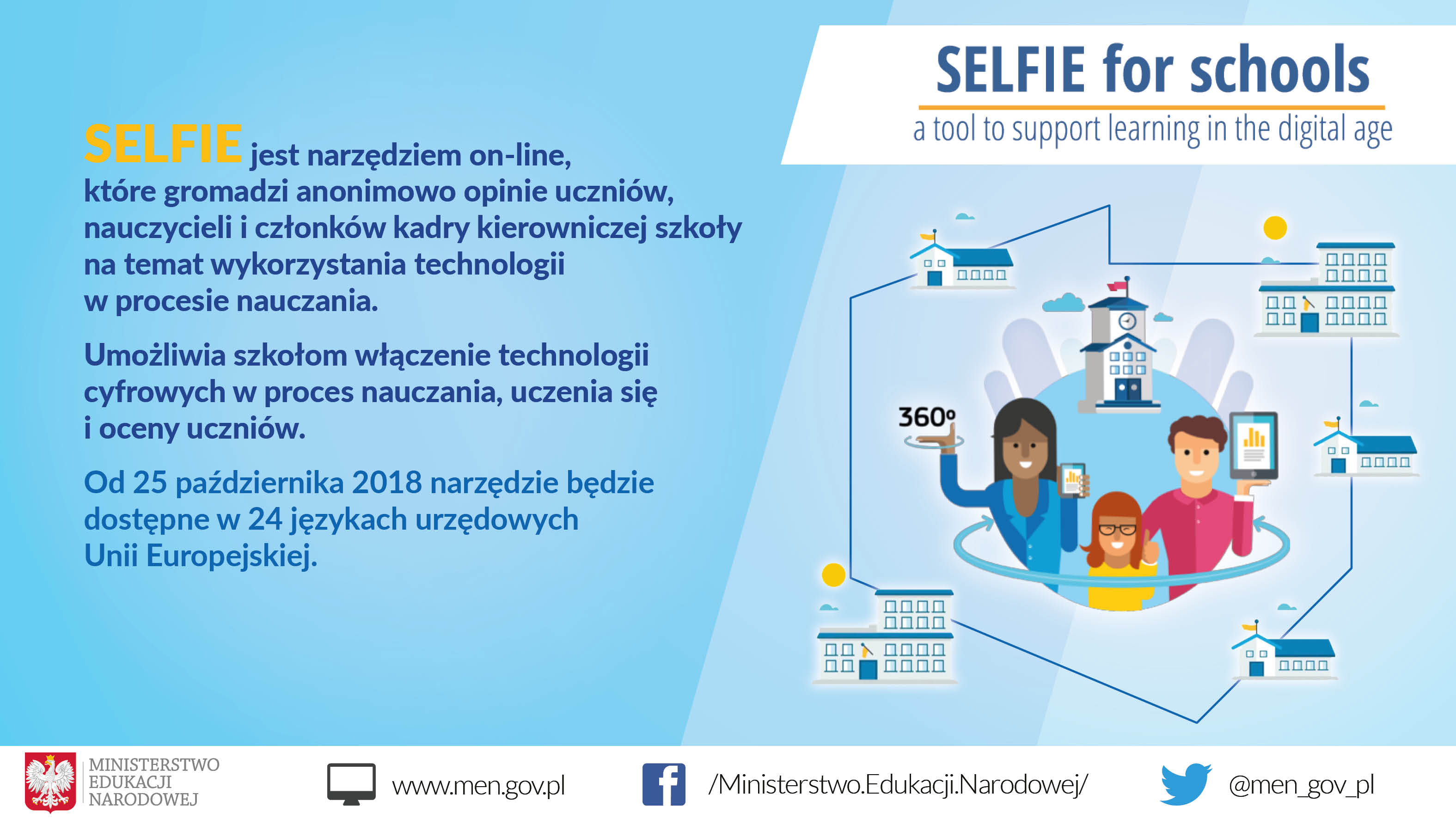 SELFIE to jedna z 11 inicjatyw planu działania w dziedzinie edukacji cyfrowej przedstawionego przez Komisję w styczniu bieżącego roku. Plan ten ma na celu rozwój umiejętności cyfrowych w Europie oraz wsparcie innowacyjnego stosowania technologii cyfrowych w uczeniu się i nauczaniu. Od czwartku narzędzie to dostępne jest w 24 językach urzędowych Unii Europejskiej.