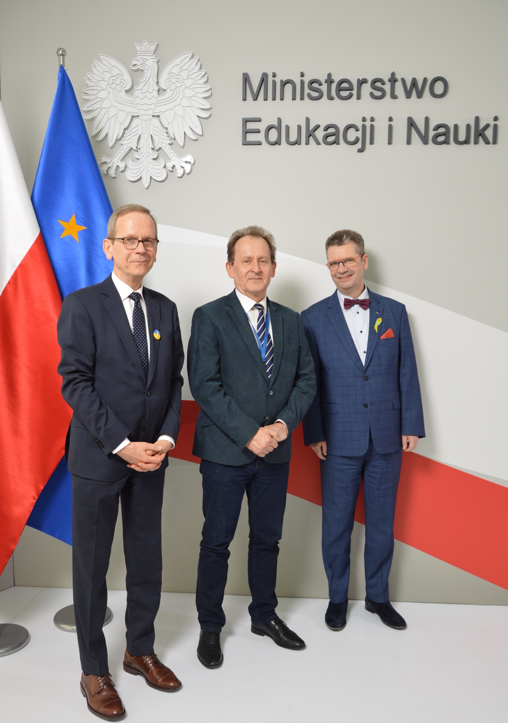 na zdjęciu stoi minister Bernacki. W po jego prawej i lewej stronie stoją rektorzy uczelni ekonomicznych. W tle flaga Polski i Unii Europejskiej. Nad ministrem i rektorami napis szary Ministerstwo Edukacji i Nauki