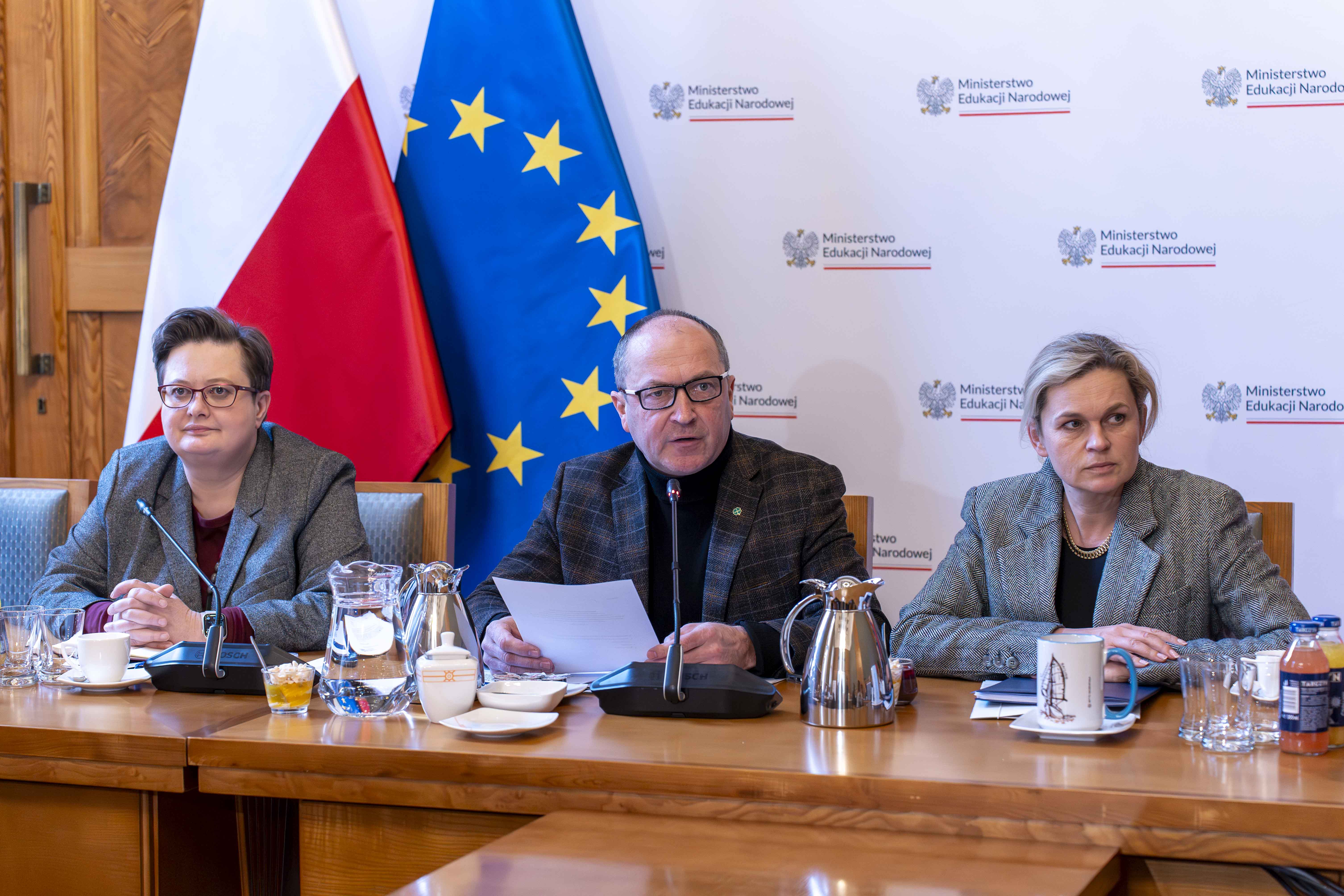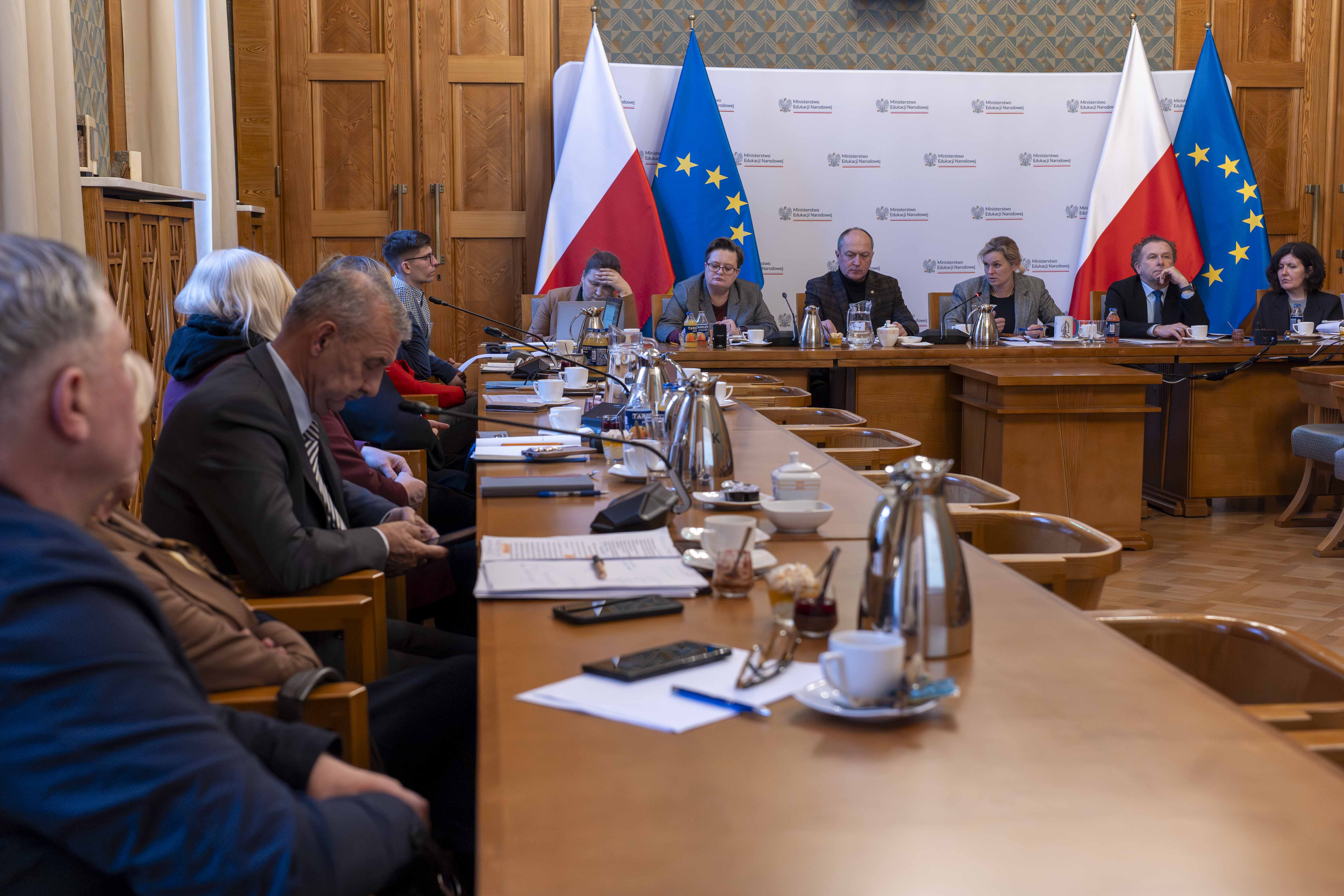 Dzisiaj w Ministerstwie Edukacji Narodowej odbyło się spotkanie uzgodnieniowe z przedstawicielami oświatowych związków zawodowych na temat projektu rozporządzenia w sprawie wysokości minimalnych stawek wynagrodzenia zasadniczego nauczycieli w 2026 r. Udział w spotkaniu wzięła Minister Edukacji Barbara Nowacka oraz pozostali członkowie Kierownictwa.