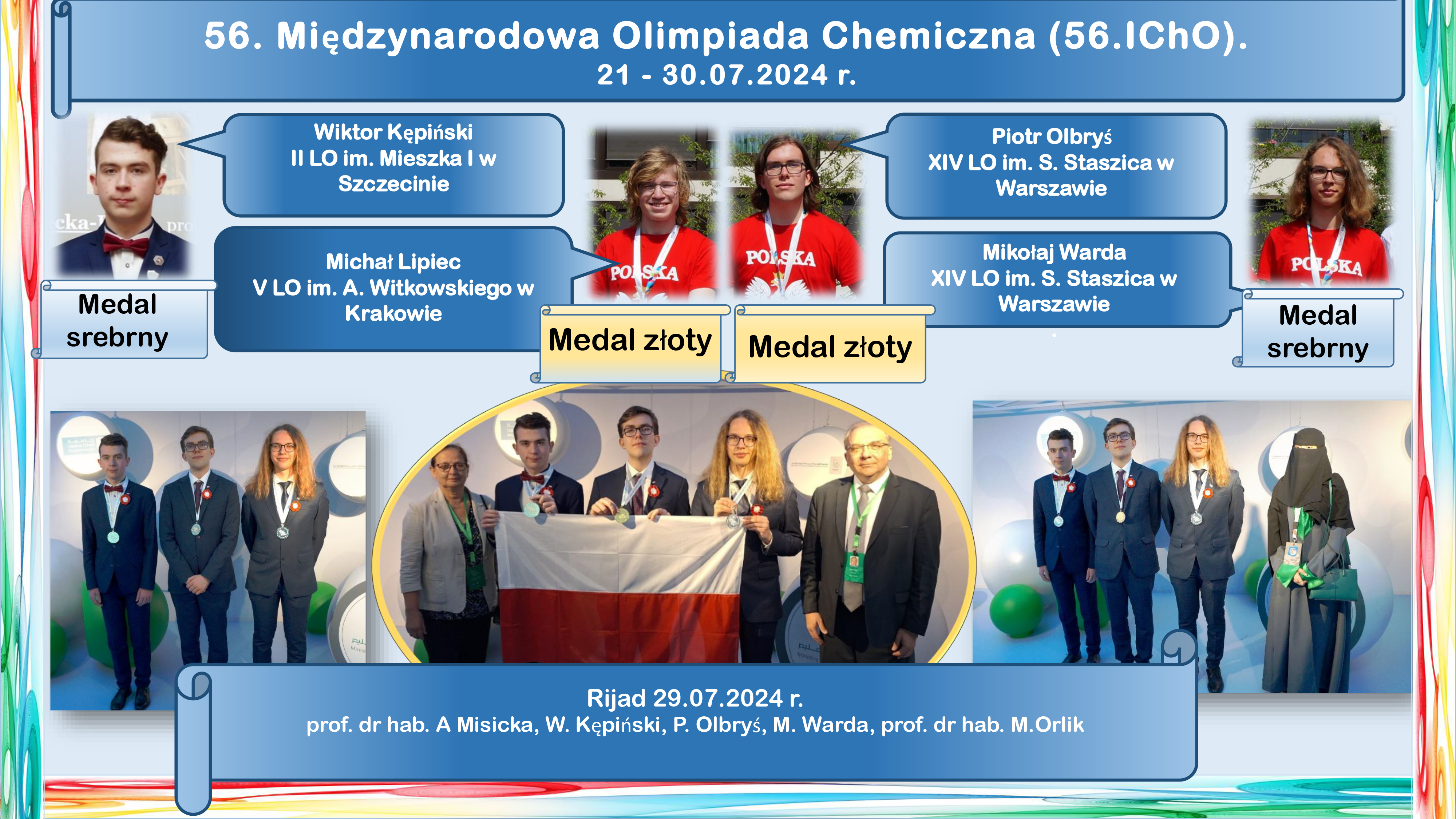 Dwa złote i dwa srebrne medale zdobyli polscy uczniowie podczas 56. Międzynarodowej Olimpiady Chemicznej w Rijadzie w Arabii Saudyjskiej. W tegorocznych zawodach udział wzięło 327 uczniów, reprezentujących 84 kraje oraz ok. 300 ich mentorów i ponad 300 wolontariuszy i pracowników przygotowujących i nadzorujących prawidłowy przebieg zawodów.