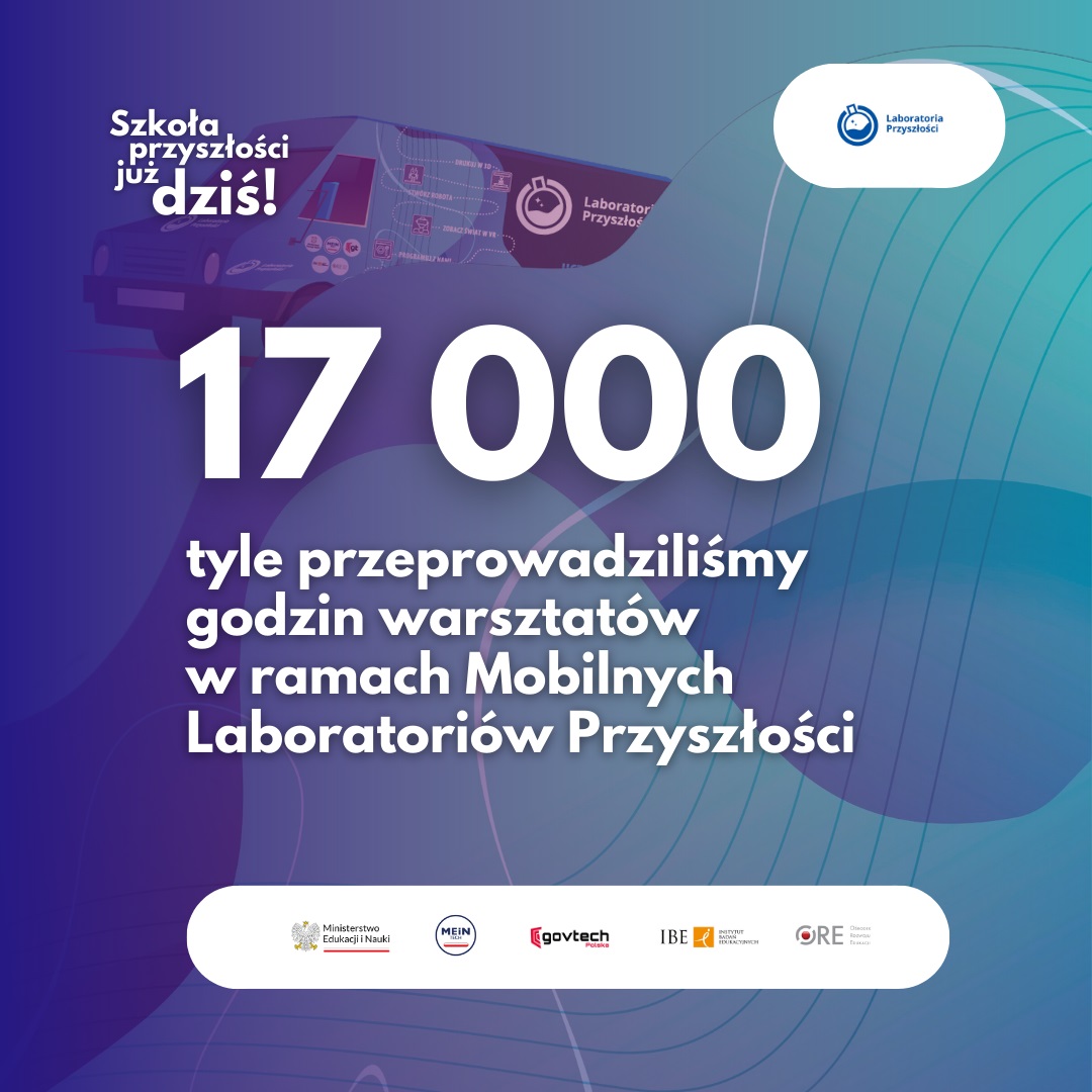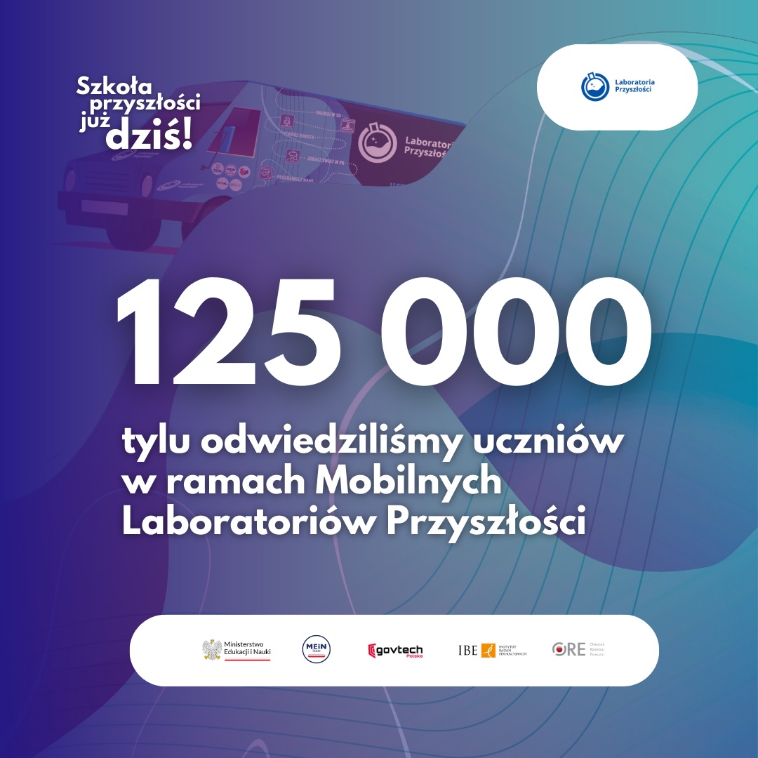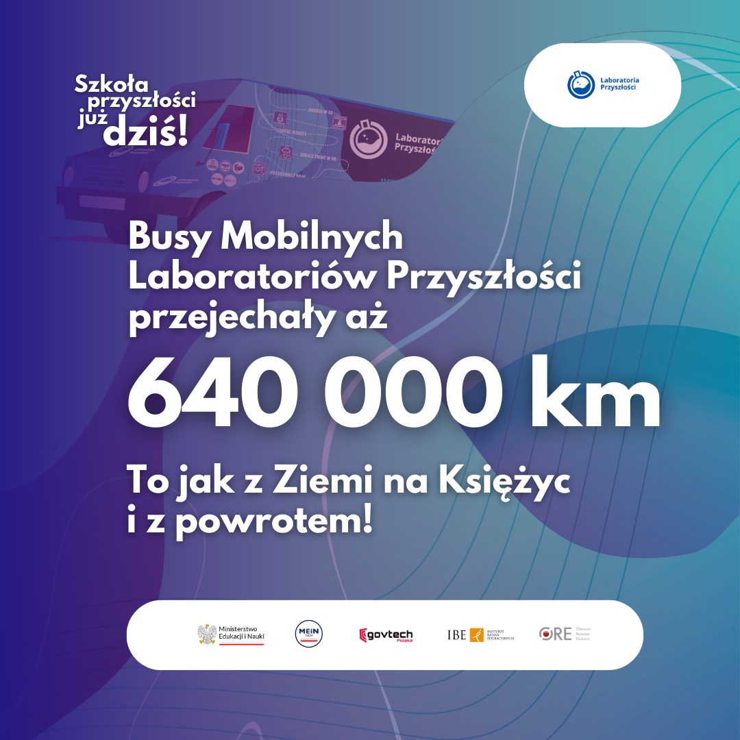 Ponad 125 tys. uczniów w 2077 szkołach skorzystało z zajęć prowadzonych przez edukatorów Mobilnych Laboratoriów Przyszłości. To ponad 17 tys. zrealizowanych godzin lekcyjnych przez 16 wojewódzkich ekip, które łącznie przejechały 640 tys. kilometrów, by dotrzeć do niemal wszystkich powiatów. Tak wygląda bilans akcji, której głównym celem była prezentacja możliwości wykorzystywania nowoczesnych sprzętów zapewnionych szkołom podstawowym w ramach programu Laboratoria Przyszłości.