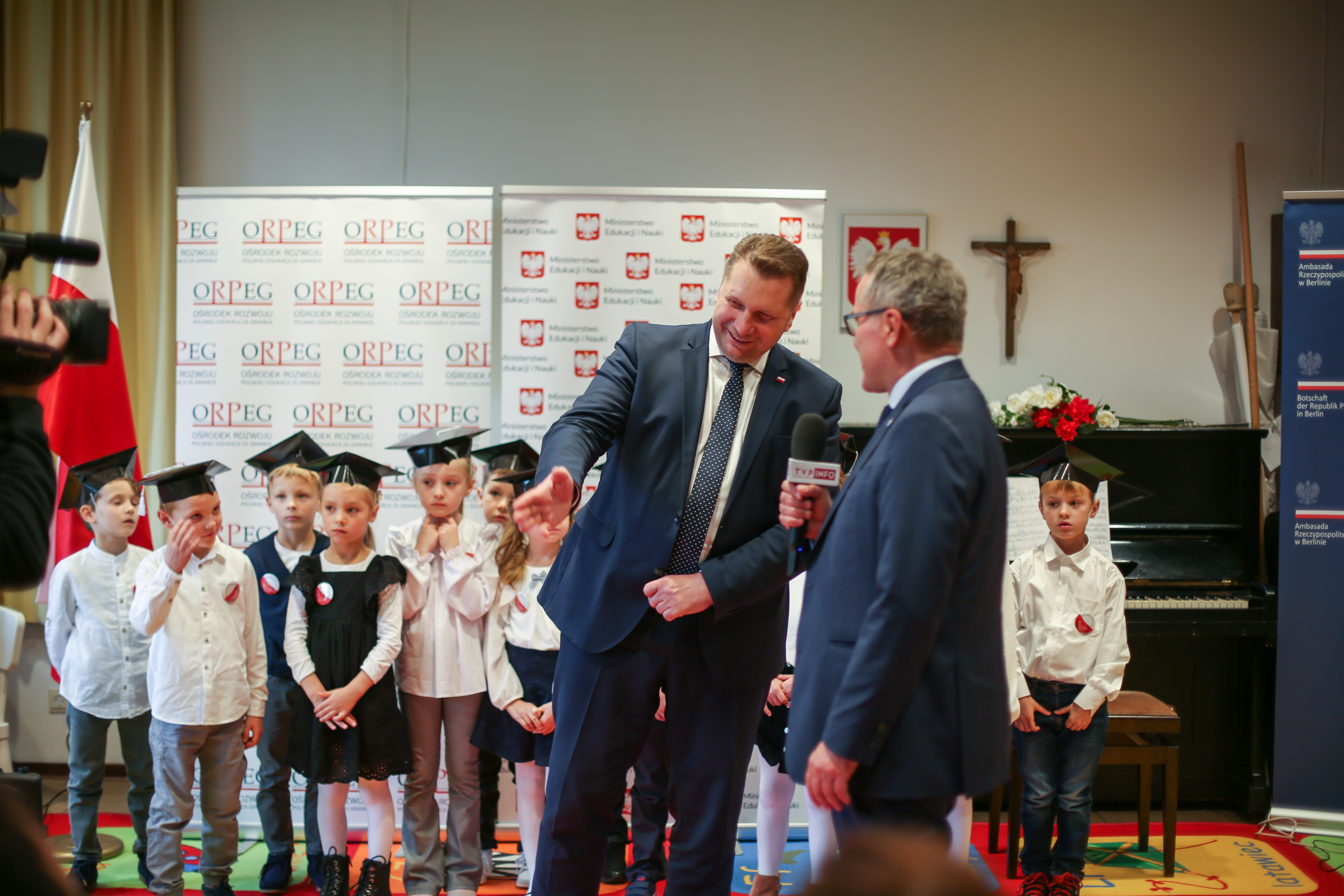 Uczestnicząc w uroczystości otwarcia oddziałów przedszkolnych w Szkole Polskiej w Berlinie, szef MEiN zapowiedział uruchomienie kolejnych polskich placówek oświatowych w Niemczech: – Dziś mamy wspaniały dzień. Otwieramy oddziały przedszkolne w Szkole Polskiej w Berlinie. Otworzymy również nowe szkoły w Bremie, Essen, Lipsku i Hanowerze. Te placówki będą funkcjonowały ze środków pochodzących z budżetu państwa.