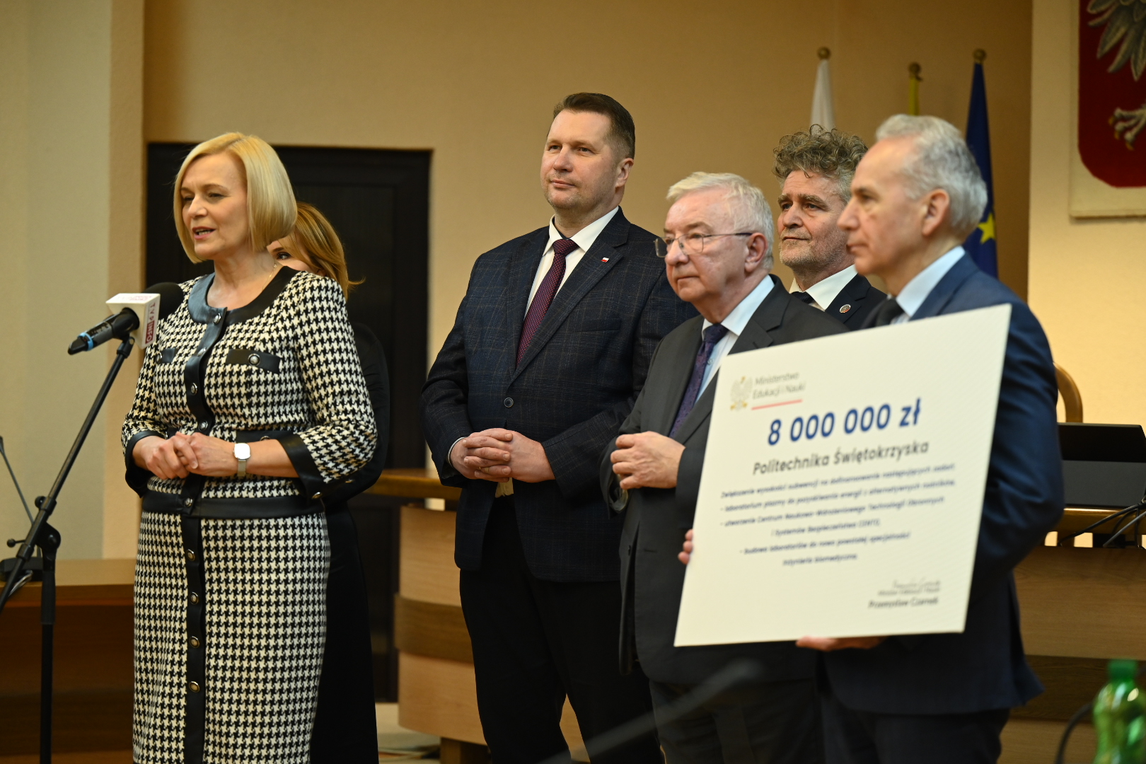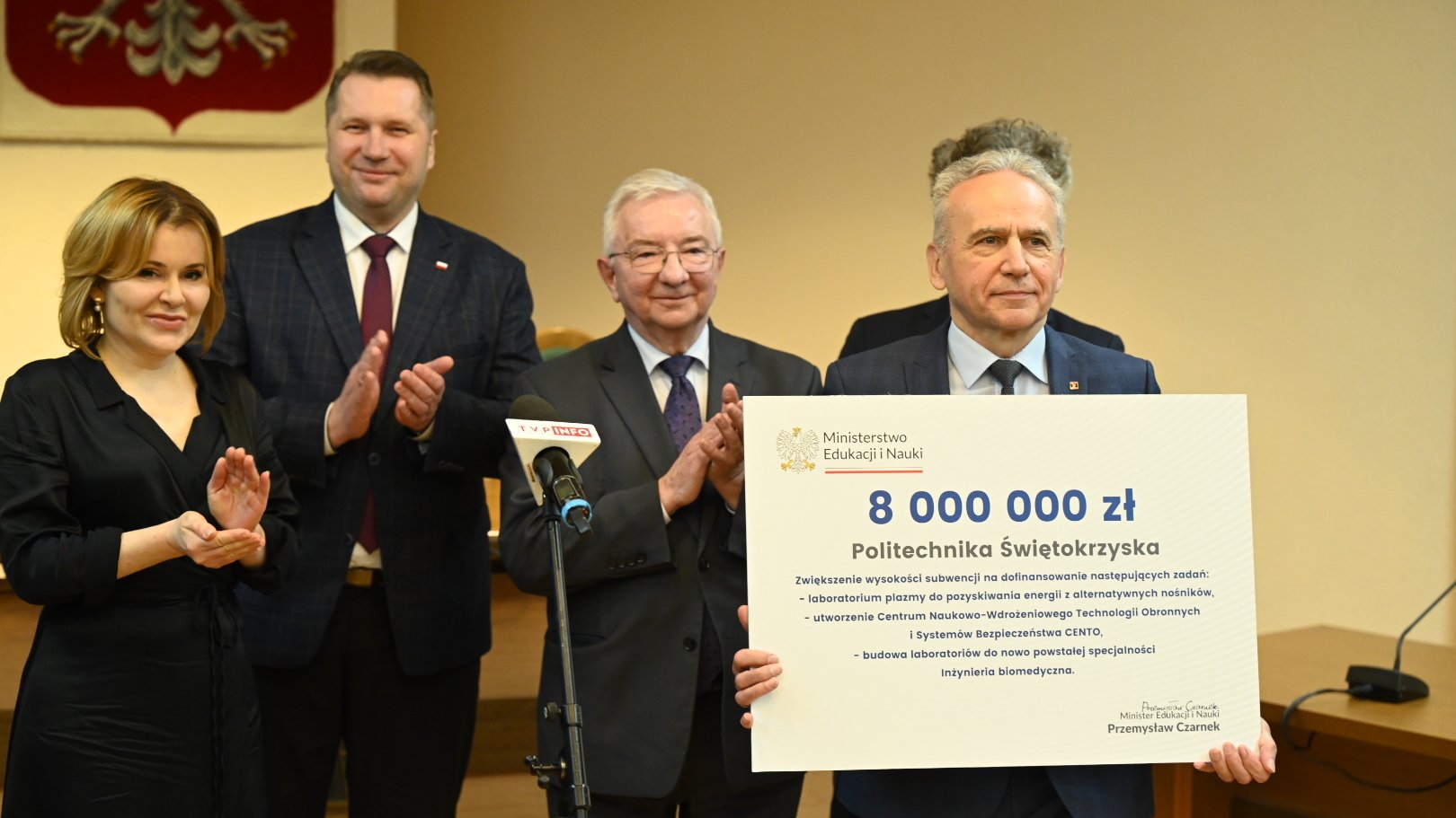 Podczas wizyty na Politechnice Świętokrzyskiej minister Przemysław Czarnek przekazał władzom uczelni symboliczny czek na kwotę 8 mln zł. To zwiększenie wysokości subwencji, które zostanie przeznaczone na dofinansowanie następujących zadań: