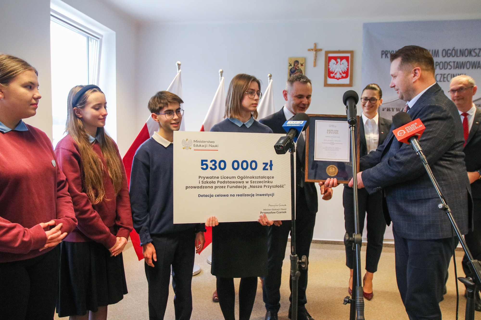 Minister Edukacji i Nauki odwiedził Prywatne Liceum Ogólnokształcące i Szkołę Podstawową w Szczecinku. To jedna z placówek, która otrzymała wsparcie w ramach drugiego rozstrzygnięcia w programie „Inwestycje w oświacie”. Podczas wizyty szef MEiN przekazał szkole symboliczny czek na kwotę 530 tys. zł. Środki zostaną przeznaczane na rozwój infrastruktury edukacyjnej i remonty.