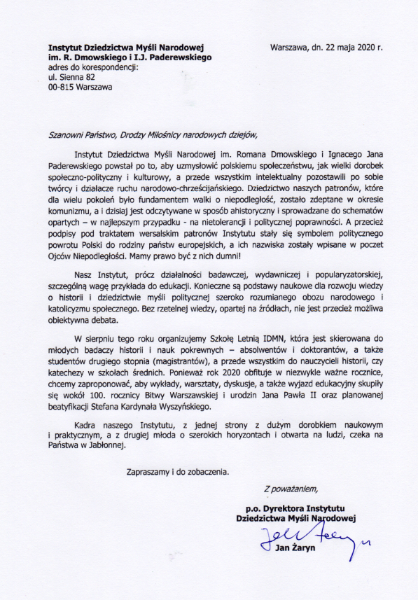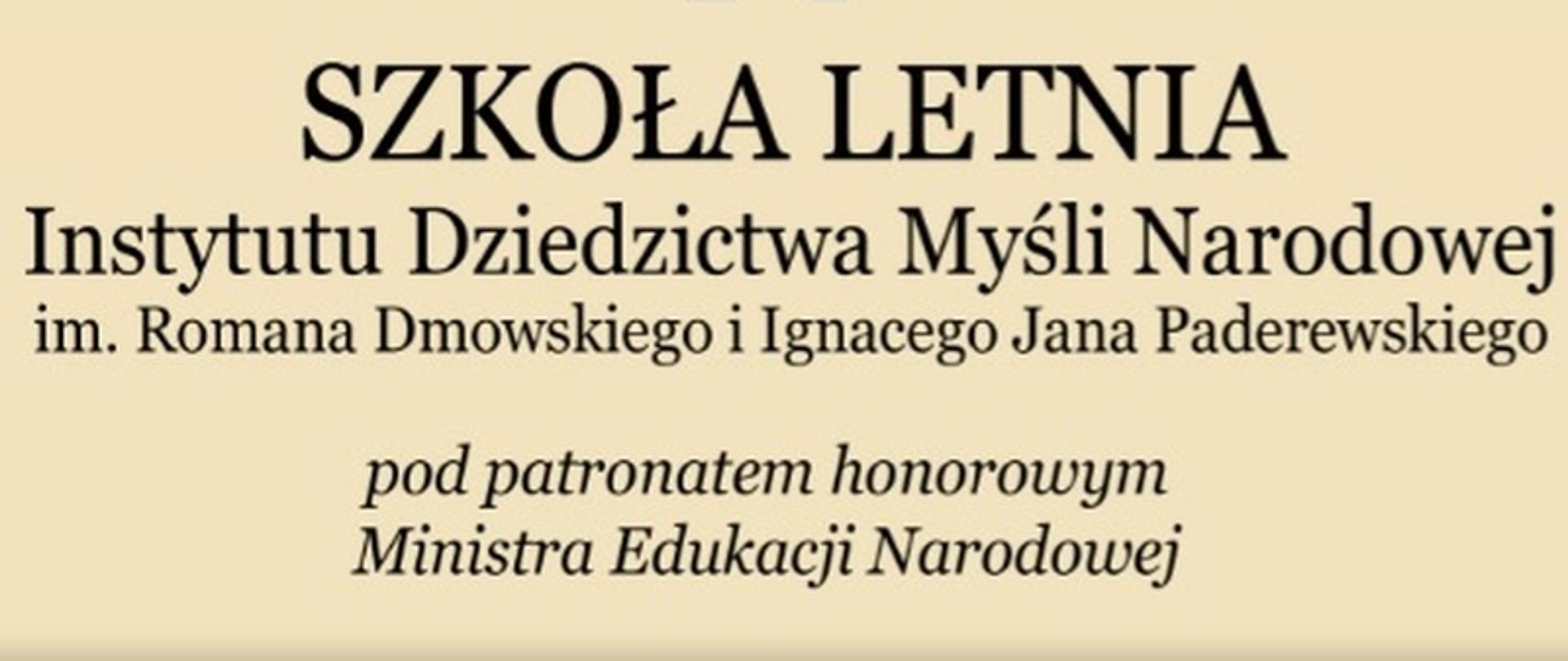 Instytut Dziedzictwa Myśli Narodowej im. Romana Dmowskiego i Ignacego Jana Paderewskiego zaprasza studentów historii drugiego stopnia, doktorantów oraz nauczycieli historii i katechetów ze szkół ponadpodstawowych do udziału w Szkole Letniej IDMN. Przedsięwzięcie odbędzie się od 17 do 20 sierpnia br. w Jabłonnie pod Warszawą. W programie przewidziano wykłady oraz warsztaty prowadzone przez doświadczonych dydaktyków. Zgłoszenia można przesyłać do 30 czerwca. Patronat nad akcją objął Minister Edukacji Narodowej.