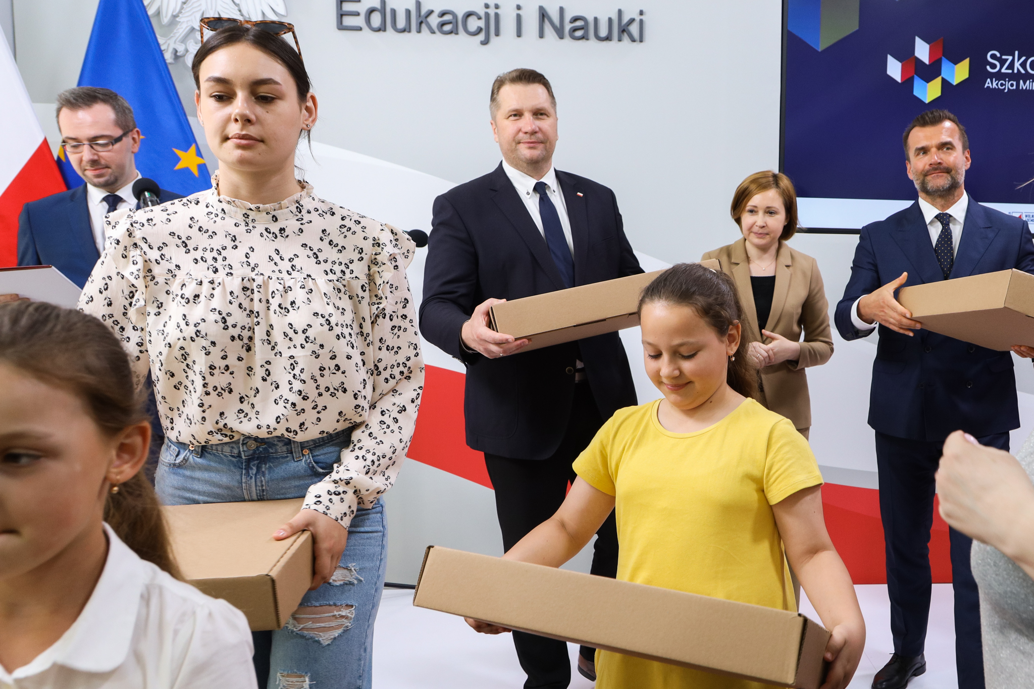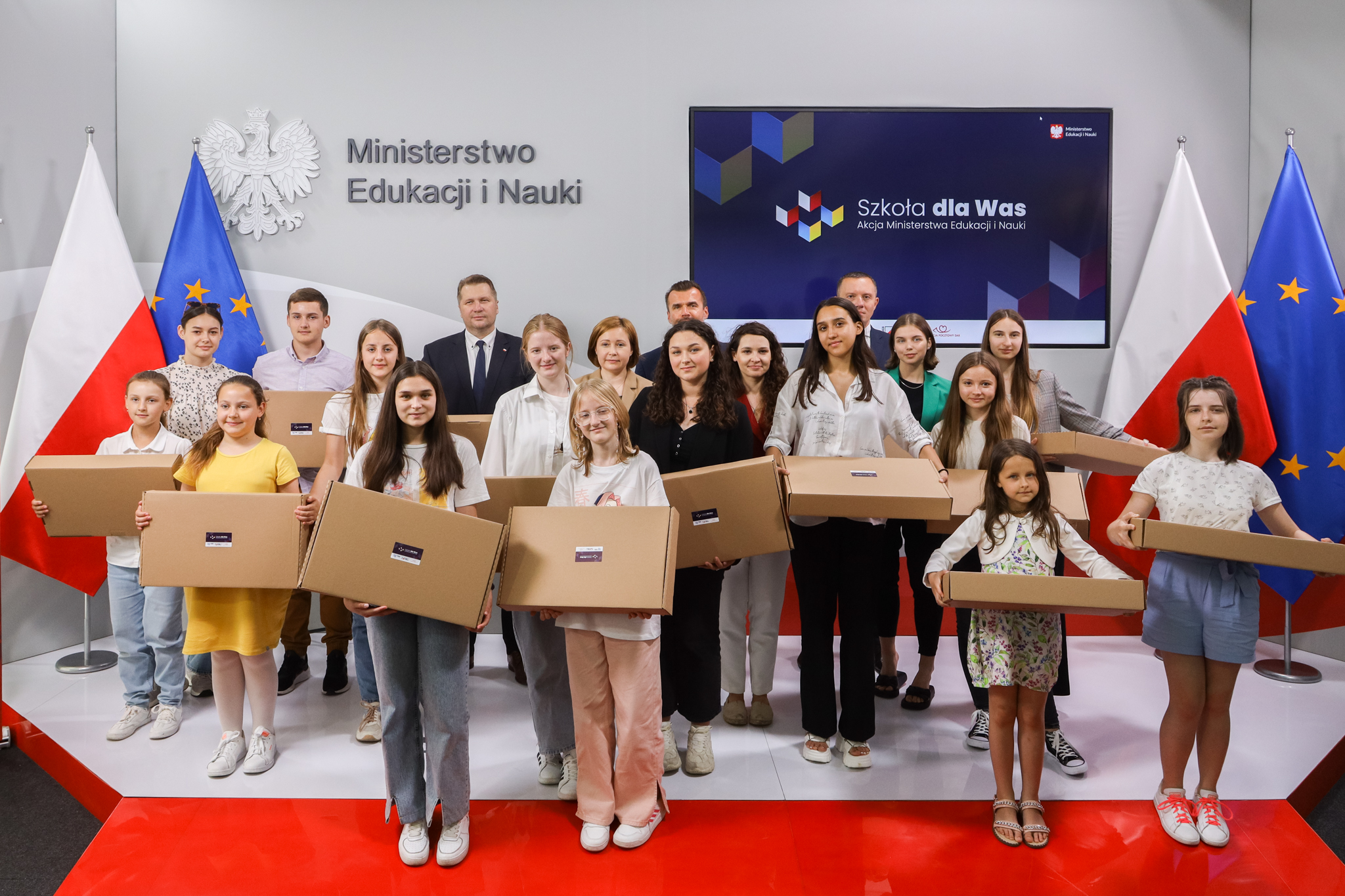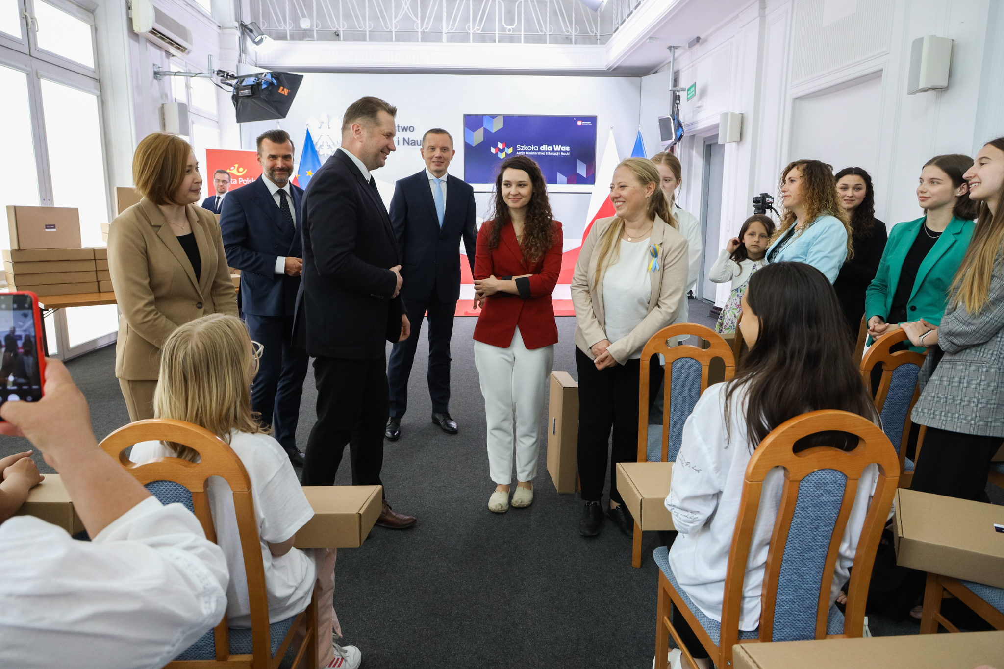 Dzieci z Ukrainy, które uczą się zdalnie, otrzymują sprzęt komputerowy w ramach akcji „Szkoła dla Was”. Inicjatywa to wspólne przedsięwzięcie Ministerstwa Edukacji i Nauki, GovTech, Związku Cyfrowa Polska oraz Poczty Polskiej i Fundacji Wolność i Demokracja. Dziś w siedzibie MEiN grupa ukraińskich dzieci wraz z opiekunami odebrała laptopy, które posłużą im do nauki zdalnej.