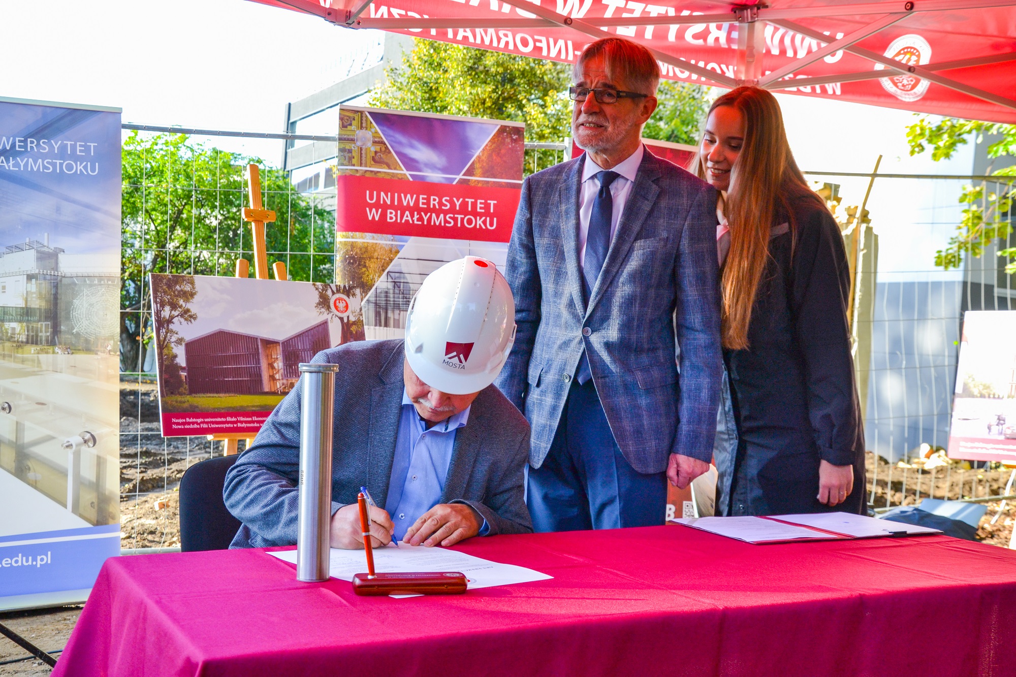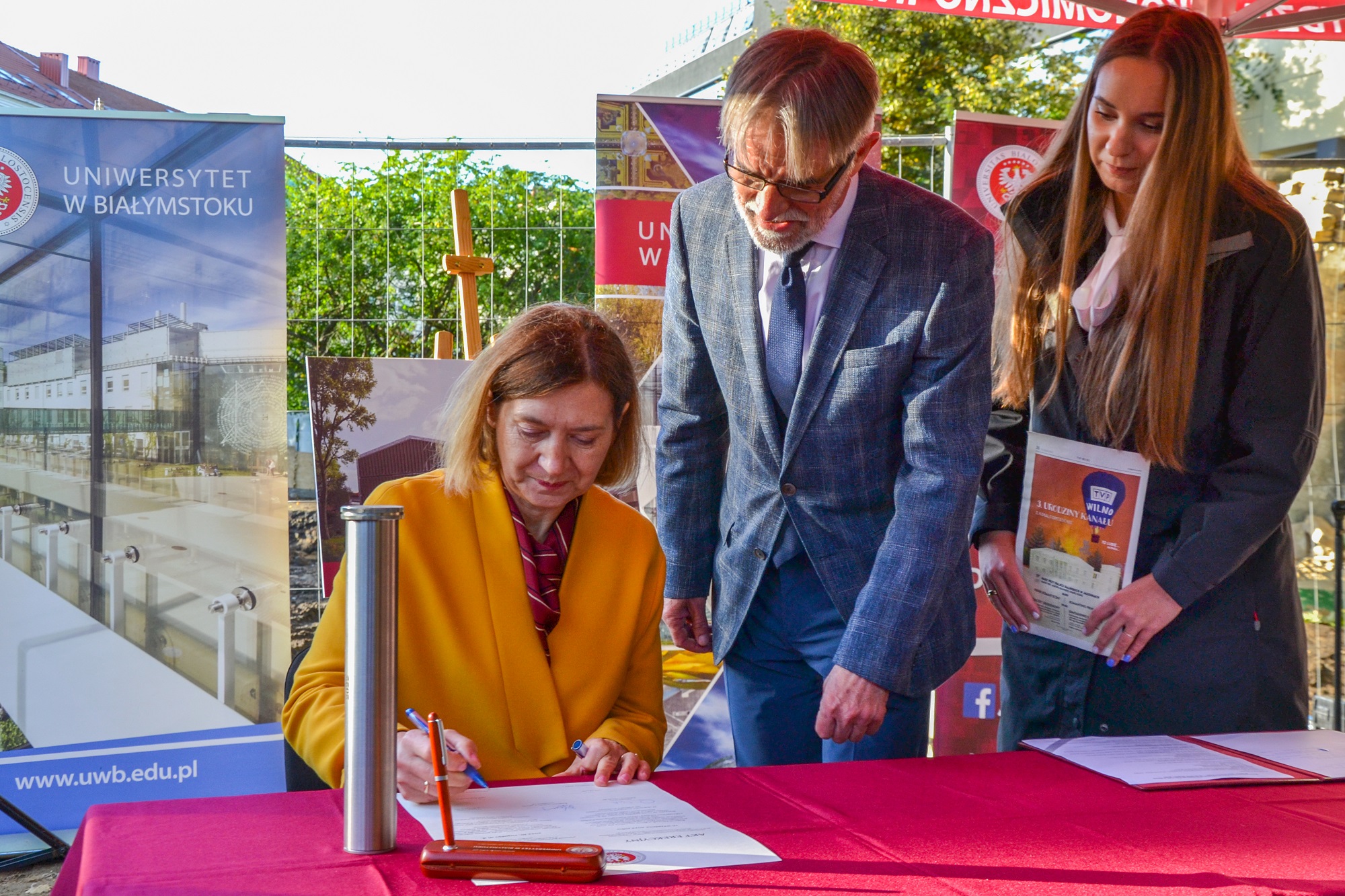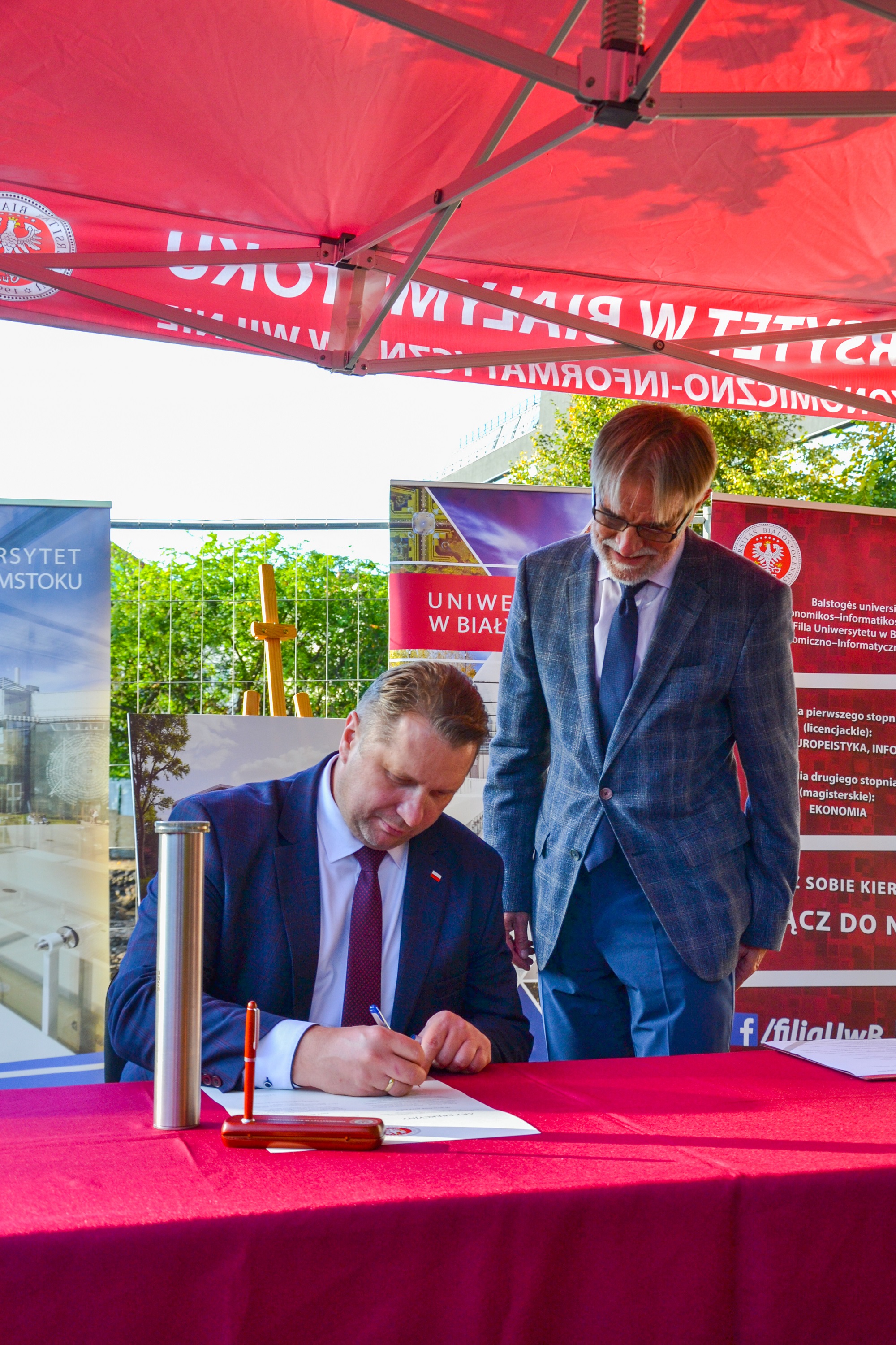 W uroczystym podpisaniu aktu erekcyjnego udział wzięli m.in. Minister Edukacji i Nauki Przemysław Czarnek, Gintautas Jakštas, wiceminister w Ministerstwie Edukacji, Nauki i Sportu Litwy i prof. dr hab. Robert W. Ciborowski, rektor Uniwersytetu w Białymstoku.