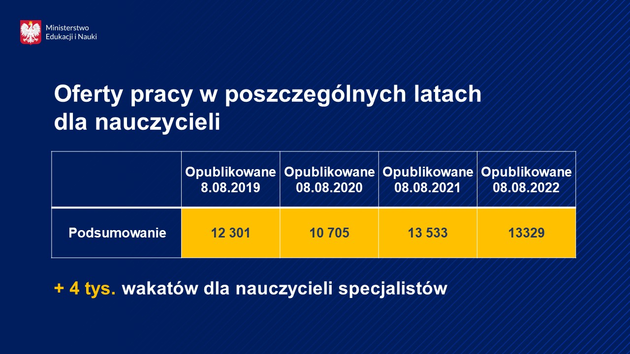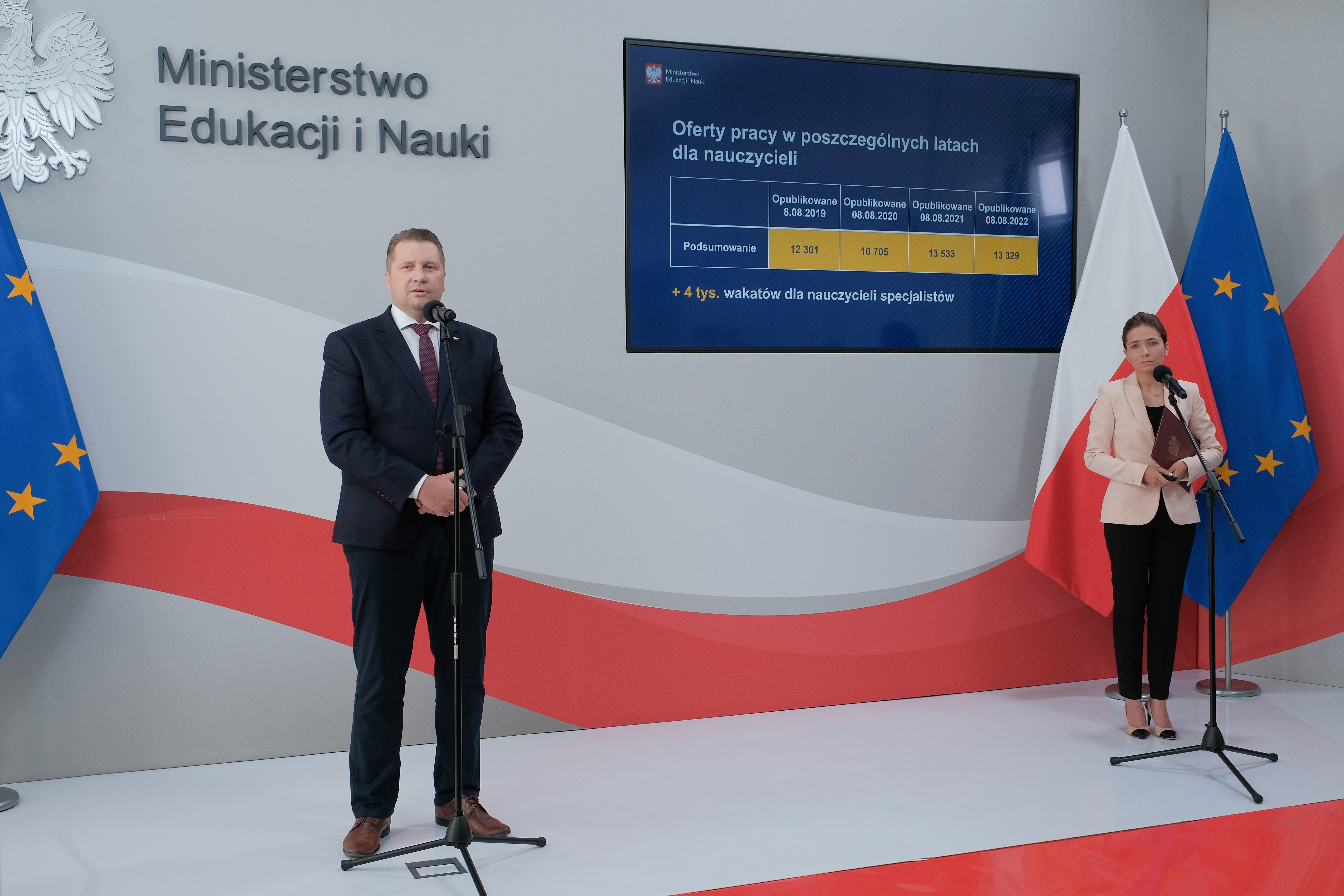 – W Polsce jest 700 tys. nauczycieli oraz 13 329 ofert pracy w szkołach. To w zaokrągleniu jedynie od 1,5 do 2 proc. wakatów, co w czasie wakacji jest naturalne ze względu na ruchy kadrowe. Dodatkowo prowadzona jest rekrutacja dla 4 tys. nauczycieli specjalistów – powiedział Minister Edukacji i Nauki podczas konferencji prasowej.