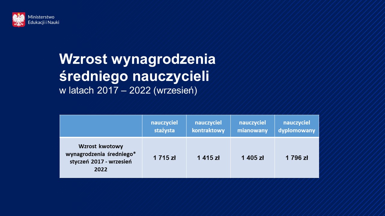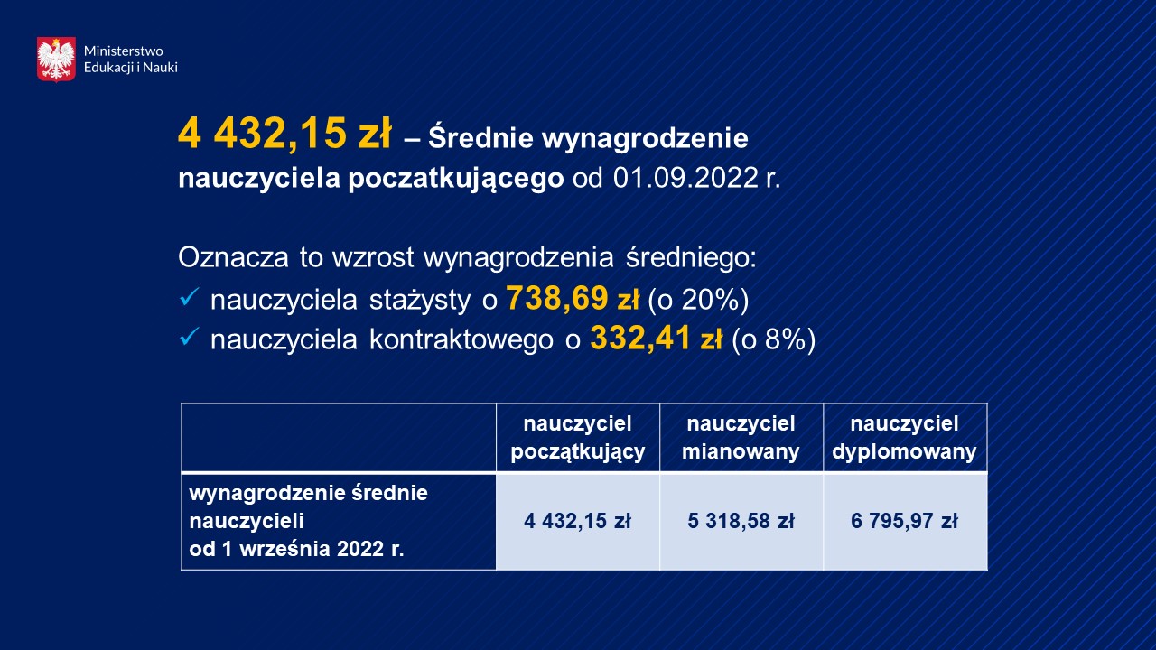 Od 1 września 2022 roku średnie wynagrodzenie dla nauczyciela poczatkującego wyniesie 4 432,15 zł. Oznacza to wzrost wynagrodzenia średniego o 738,69 zł (o 20%) dla nauczyciela stażysty oraz o 332,41 zł (o 8%) dla nauczyciela kontraktowego.