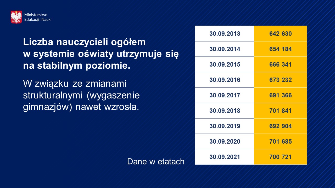 Liczba nauczycieli w systemie oświaty utrzymuje się na stabilnym poziomie. W związku ze zmianami strukturalnymi (wygaszenie gimnazjów) wzrosła w ostatnich latach. Od 30 września 2013 r. mamy w systemie oświaty ponad 58 tys. etatów więcej (58 091 – dane na 8 sierpnia 2022 r.).