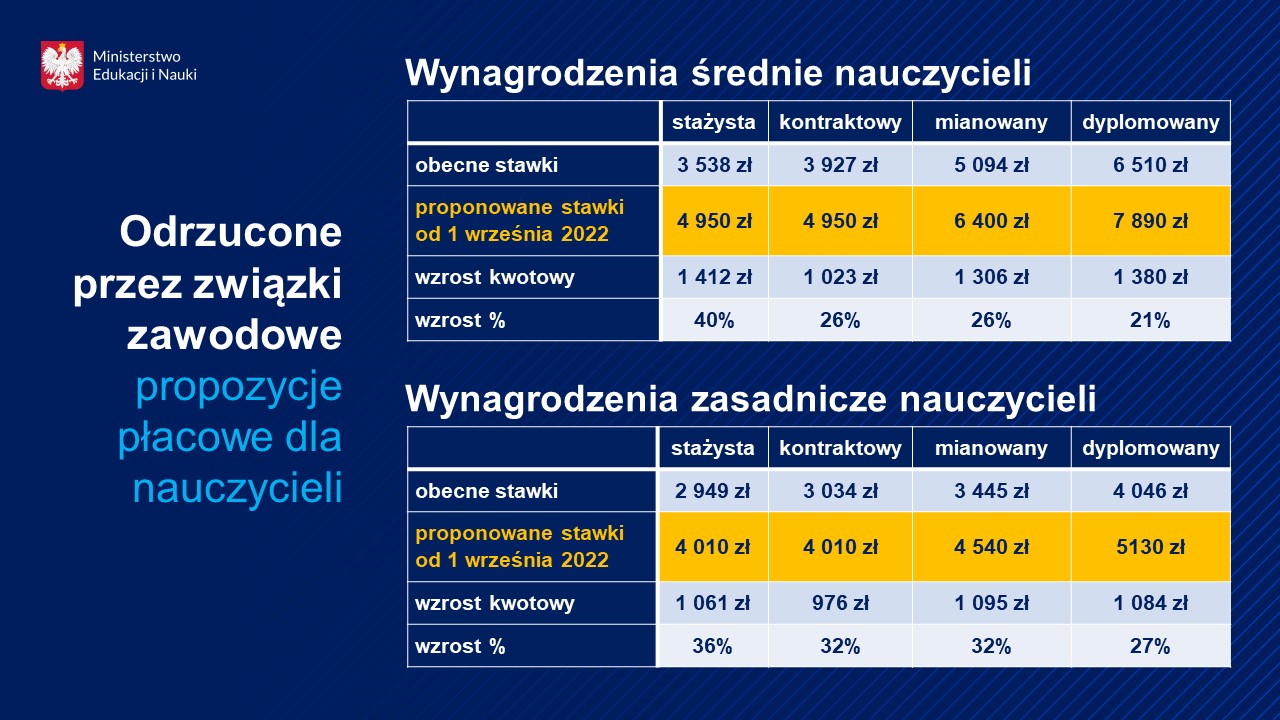 Szef MEiN przedstawił odrzucone przez Związek Nauczycielstwa Polskiego propozycje płacowe dla nauczycieli. Ministerstwo Edukacji i Nauki proponowało wzrost wynagrodzenia zasadniczego od 1 września 2022 r. w wysokości: