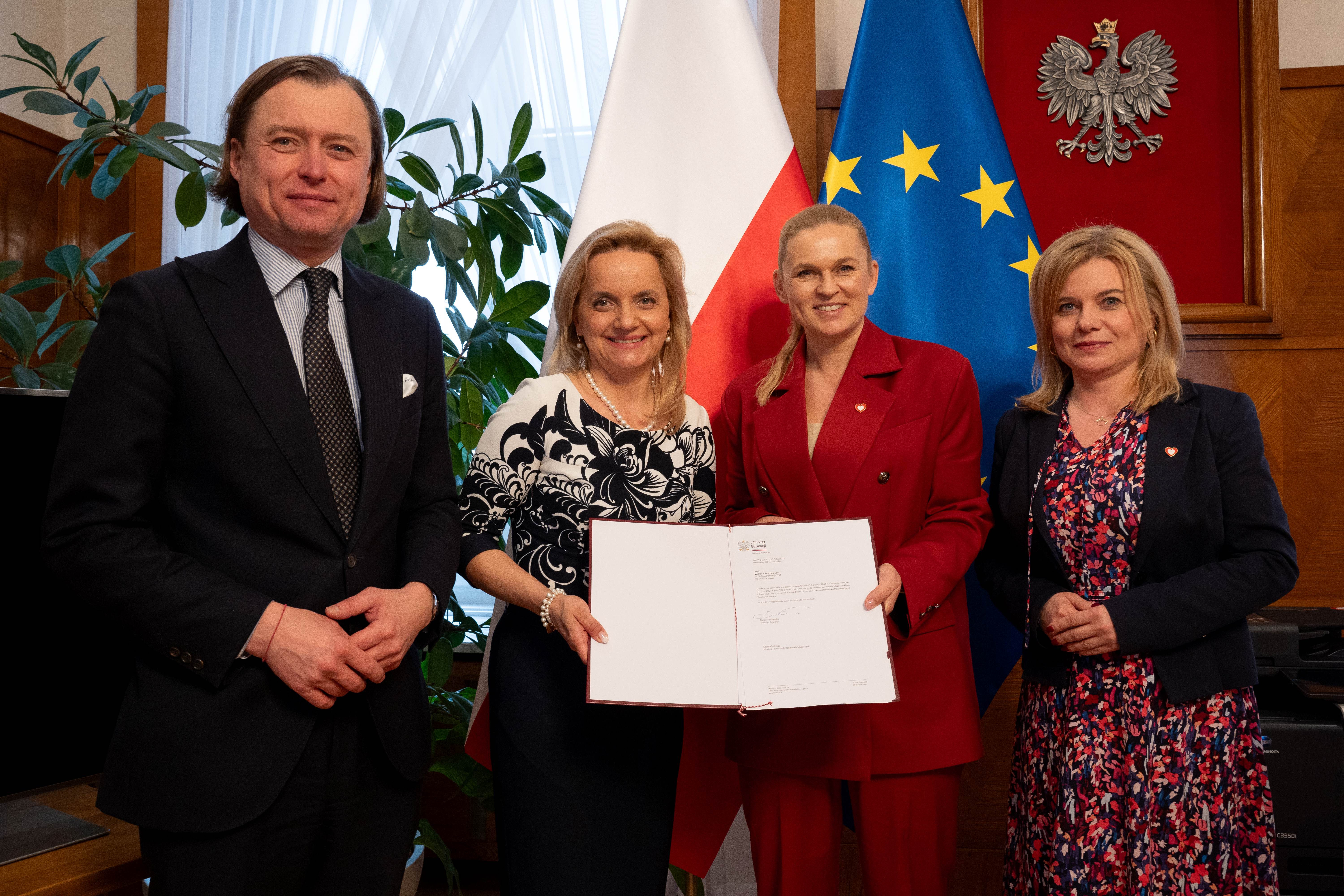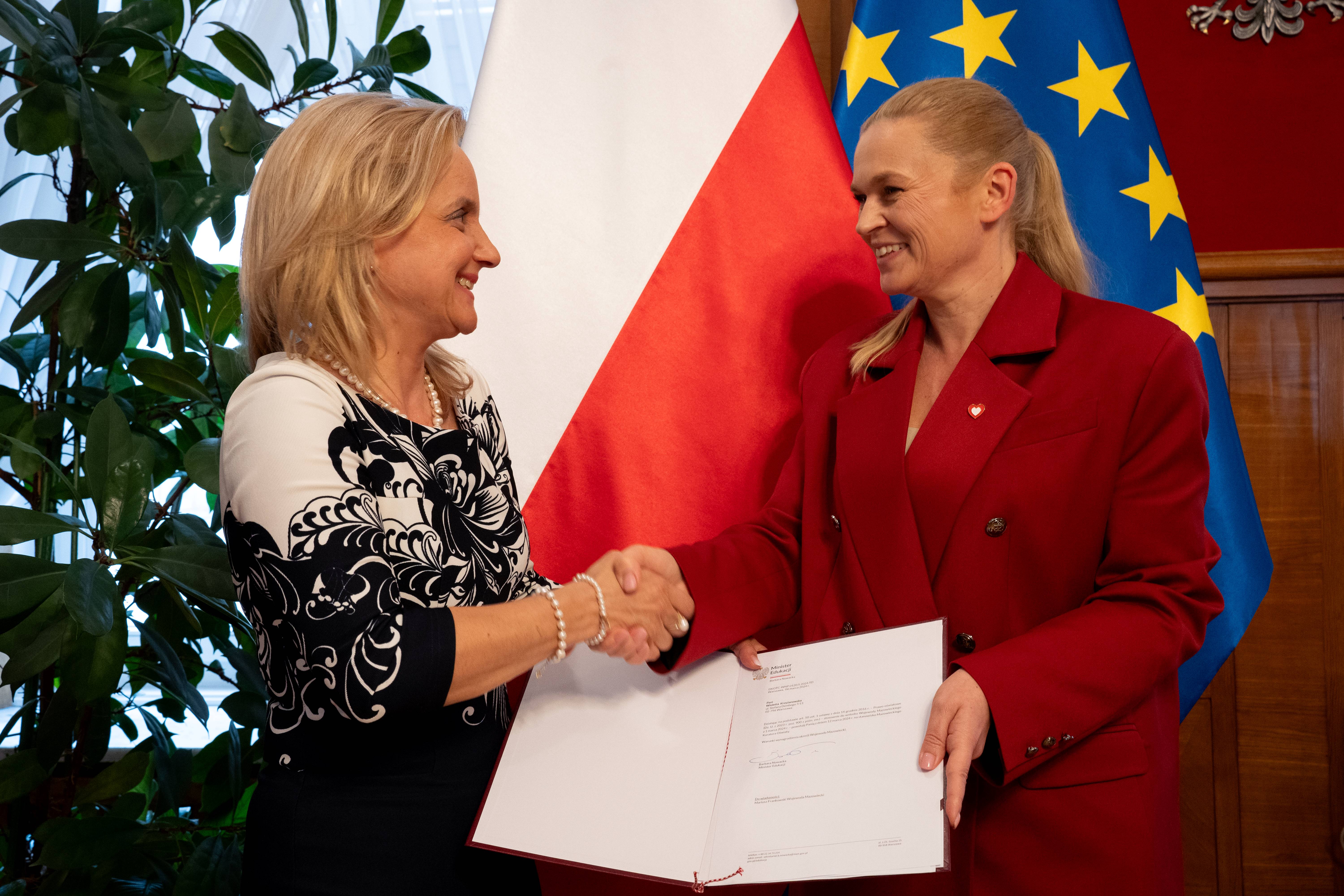 Minister Barbara Nowacka wręczyła dzisiaj akt powołania na Mazowieckiego Kuratora Oświaty Wioletcie Krzyżanowskiej.
