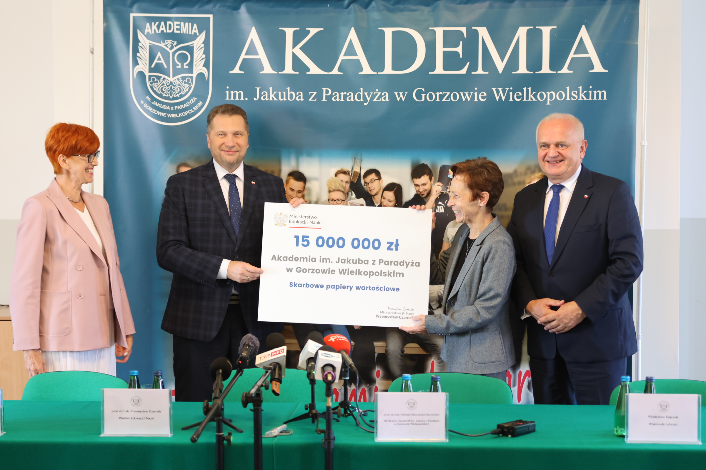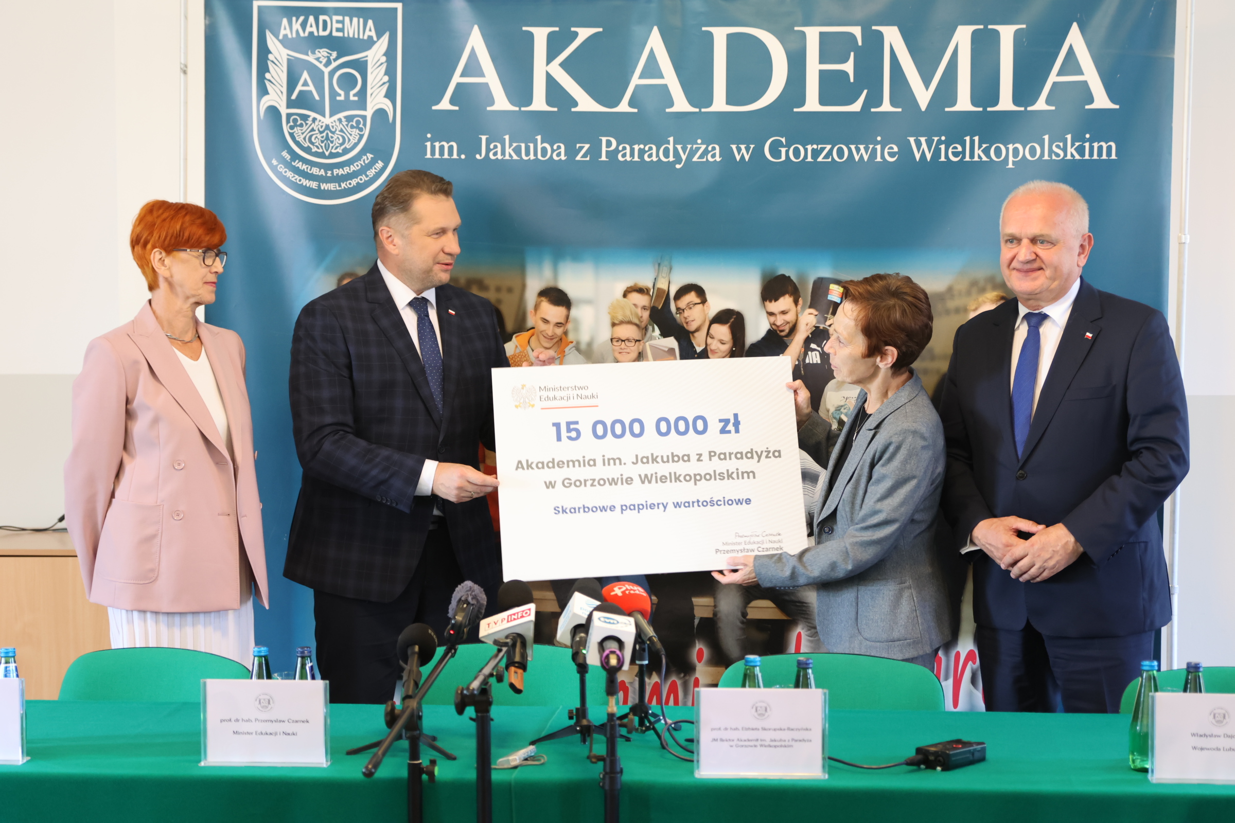 Ministerstwo Edukacji i Nauki wspiera rozwój szkół wyższych w mniejszych ośrodkach i byłych miastach wojewódzkich. Te uczelnie to lokalne centra wiedzy, które współpracują z otoczeniem społeczno-gospodarczym i kształcą specjalistów na potrzeby rynku pracy w regionie. Jedną z nich jest Akademia im. Jakuba z Paradyża w Gorzowie Wielkopolskim, która otrzyma 15 mln zł w formie obligacji Skarbu Państwa na działania związane z utrzymaniem i rozwojem potencjału dydaktycznego oraz badawczego. Szef MEiN przekazał władzom uczelni symboliczny czek opiewający na tę kwotę.