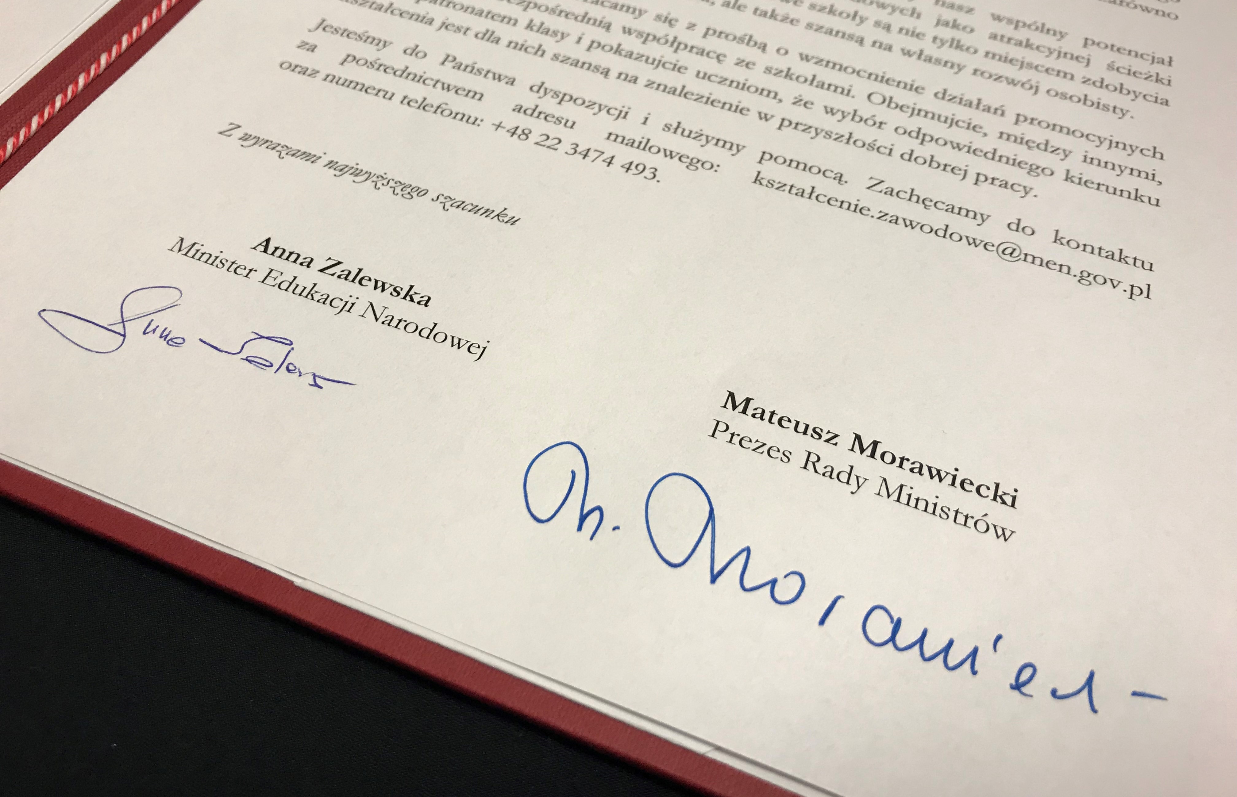 Prezes Rady Ministrów Mateusz Morawiecki i Minister Edukacji Narodowej Anna Zalewska wystosowali specjalny list do pracodawców, w którym zwracają się do nich o podjęcie działań na rzecz kształcenia zawodowego, m.in. obejmowanie patronatem szkół zawodowych.