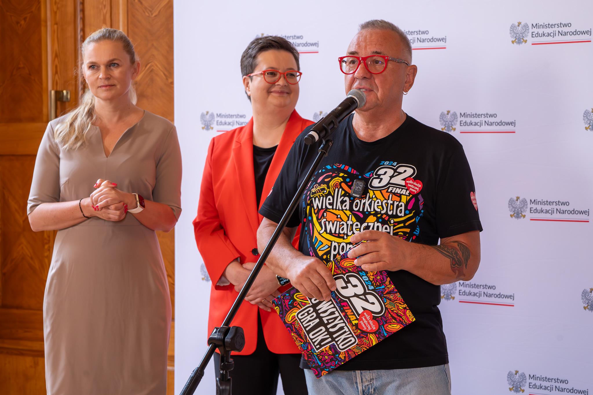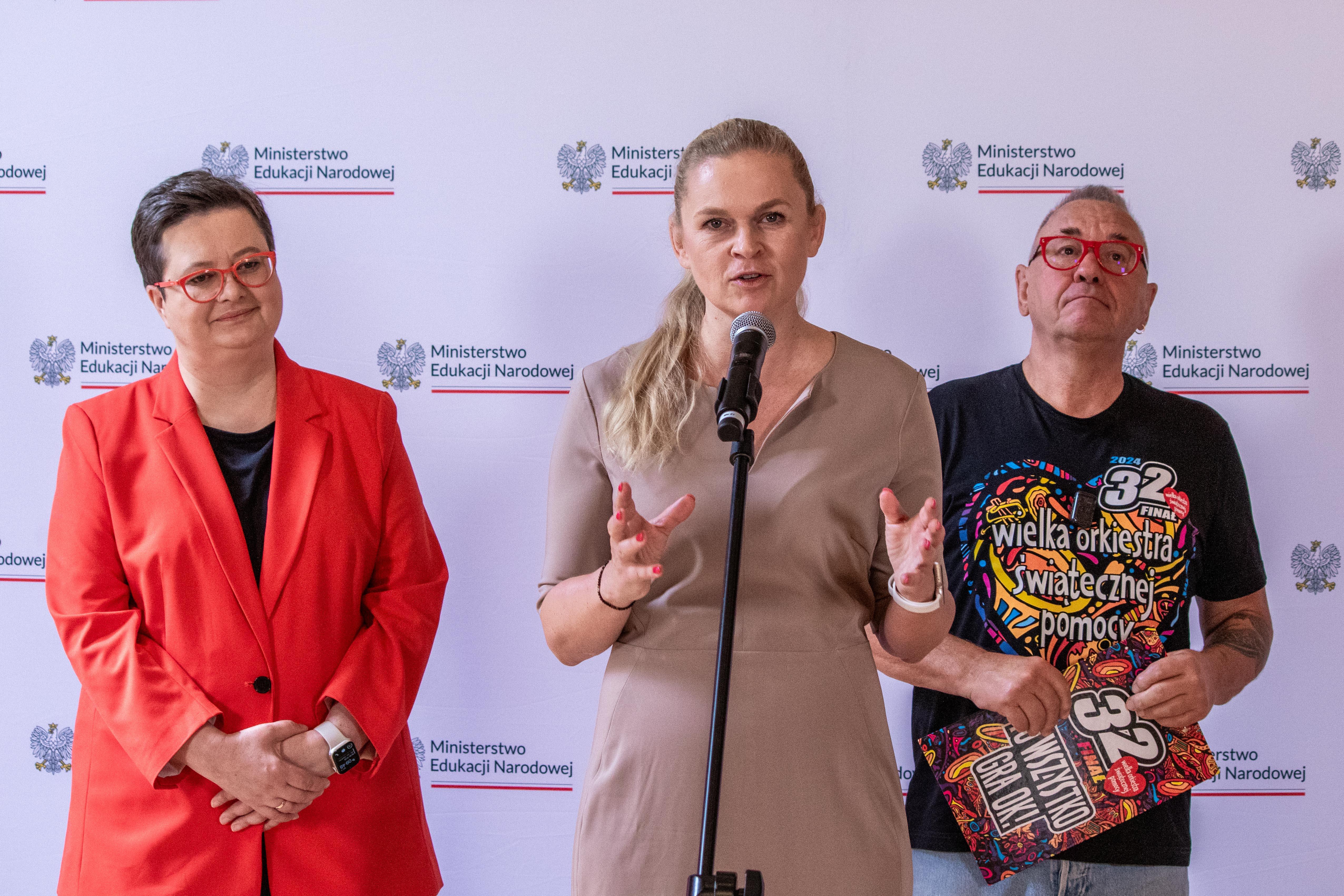 Dziś w Ministerstwie Edukacji Narodowej odbyła się konferencja prasowa dotycząca współpracy MEN z Wielką Orkiestrą Świątecznej Pomocy. Uczestniczyli w niej minister Barbara Nowacka, sekretarz stanu Katarzyna Lubnauer oraz Jerzy Owsiak, prezes zarządu Fundacji WOŚP. Głównym tematem spotkania była organizacja zajęć pierwszej pomocy dla uczniów szkół podstawowych i ponadpodstawowych.