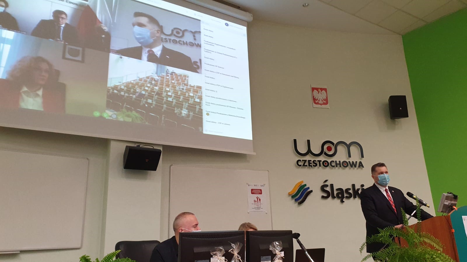 Biała ścianka z logotypem WOM Częstochowa. Na środku zdjęcia minister Przemysław Czarnek stoi przy mikrofonie. Minister ubrany w garnitur ma maseczkę na twarzy. Po lewej stronie ministra Śląski Kurator Oświaty Urszula Bauer. Jest ubrana na ciemno, na twarzy ma okulary i maseczkę. Po prawej stronie kobieta w biało-czarnej sukience. Na twarzy ma okulary i maseczkę.