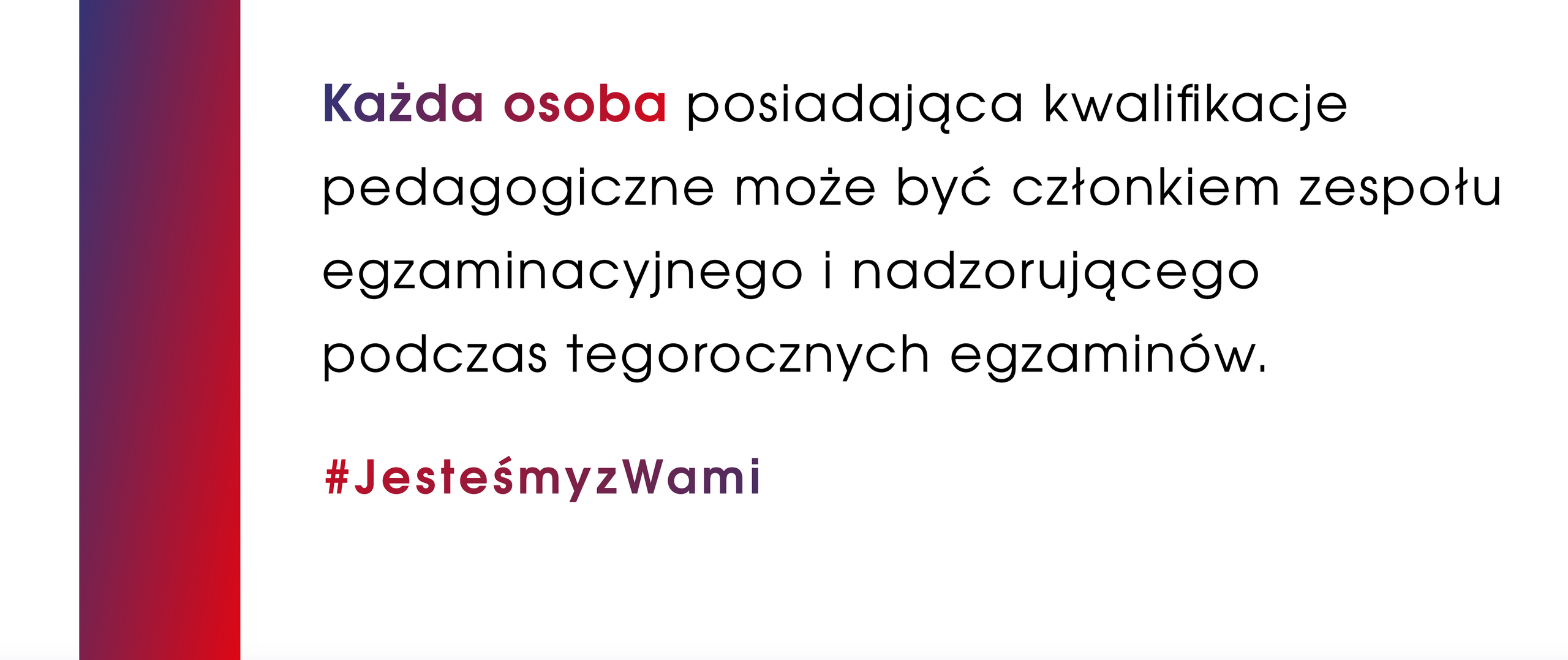 W sytuacji, gdy nie będzie możliwości powołania zespołu egzaminacyjnego oraz zespołów nadzorujących spośród nauczycieli zatrudnionych w szkole, w której przeprowadzany jest egzamin, skład tych zespołów może zostać uzupełniony przez innych nauczycieli spoza danej szkoły, w tym osoby, które mają kwalifikacje nauczycielskie, a nie pracują w żadnej szkole czy placówce.