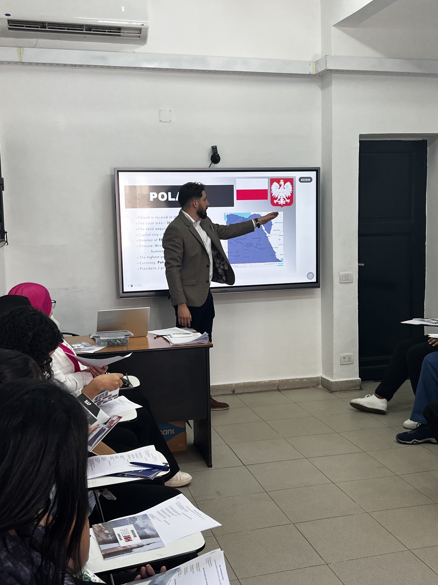 Podczas wydarzenia mieliśmy okazję gościć p. Norberta Ślusarczyka, arabistę, tłumacza przysięgłego języka arabskiego, popularyzatora języków polskiego i arabskiego, który przygotował i poprowadził 4 lekcje języka polskiego dla uczniów egipskich szkół średnich. W popołudniowej części wydarzenia nasz gość przedstawił szerszej już publiczności język polski w sposób kompleksowy, ze szczególnym uwzględnieniem zapożyczeń pochodzenia arabskiego. Celem była promocja wiedzy o języku polskim, powiązana z elementami historii i kultury. Prezentacje p. Norberta, prowadzone w języku arabskim, spotkały się z dużym zainteresowaniem wśród słuchaczy, efektywnie wzbudzając zainteresowanie naszym krajem, językiem i kulturą, co wyraźnie można było zaobserwować na przygotowanym przez nas stoisku kulturalnym. Znalazły się na nim materiały i gadżety, związane z językiem, historią i kulturą Polski, a poprzez m.in. przygotowane quizy sprawdzana była też wiedza uczestników.